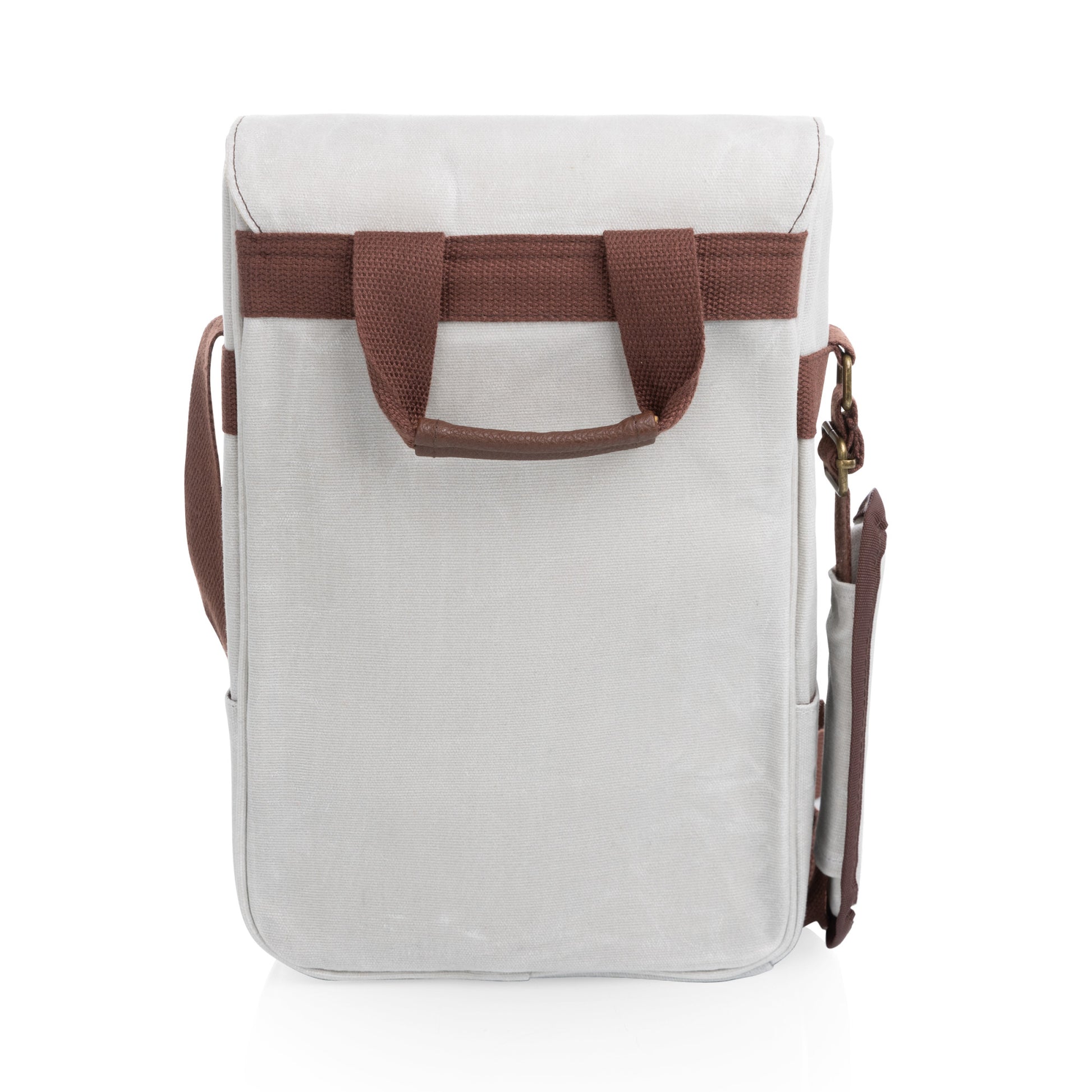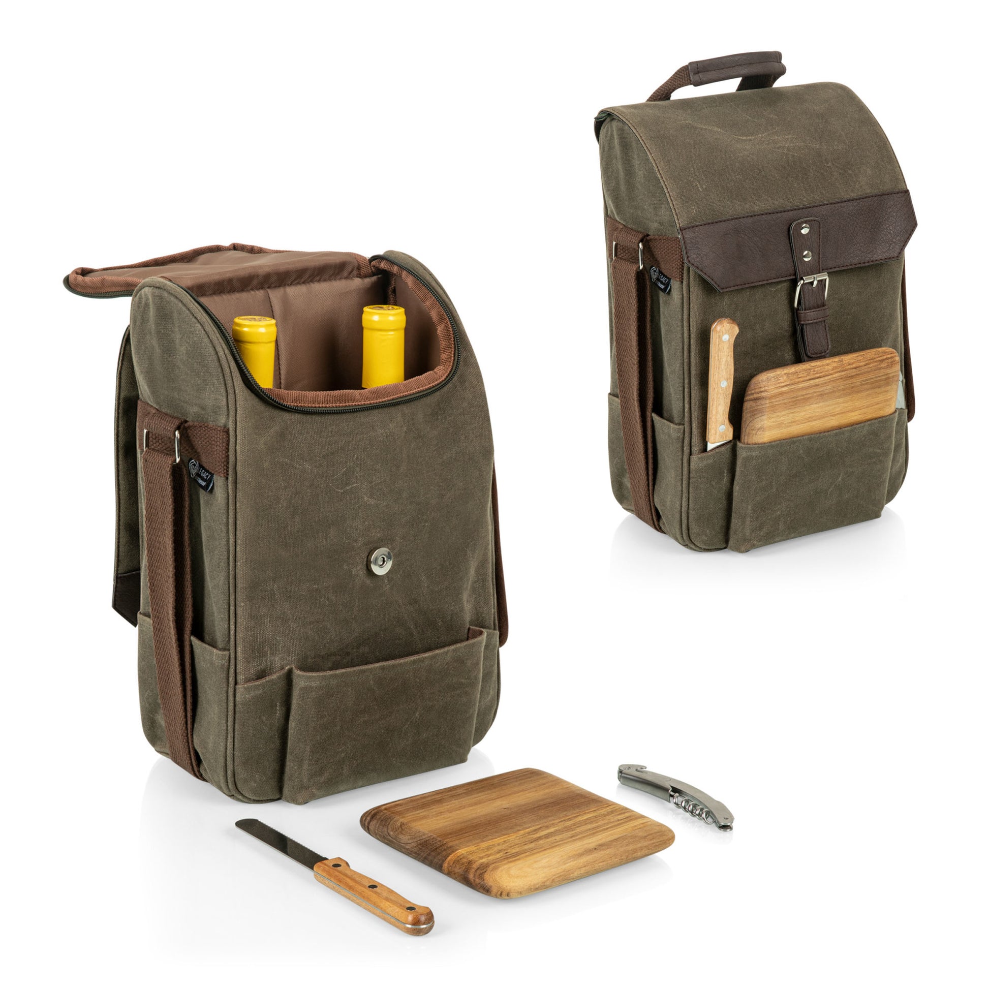 Made of waxed cotton canvas and soft pebbled leatherette; Removable interior divider; Complete with a waiter-style corkscrew, cheese knife, and Acacia wood serving board tucked into convenient front pocket.