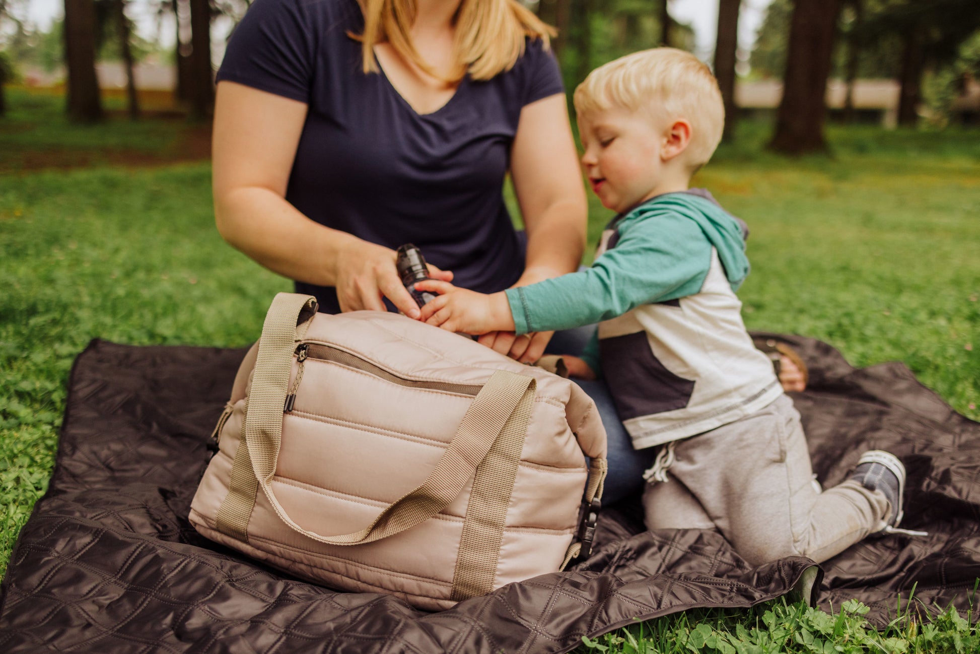 Plush quilting; Water resistant liner with removable heat-sealed insert for support; Machine washable; Detachable shoulder strap and comfortable bag handles; Full-length zipper closure; Front storage pocket; 21" x 8" x 12.6"