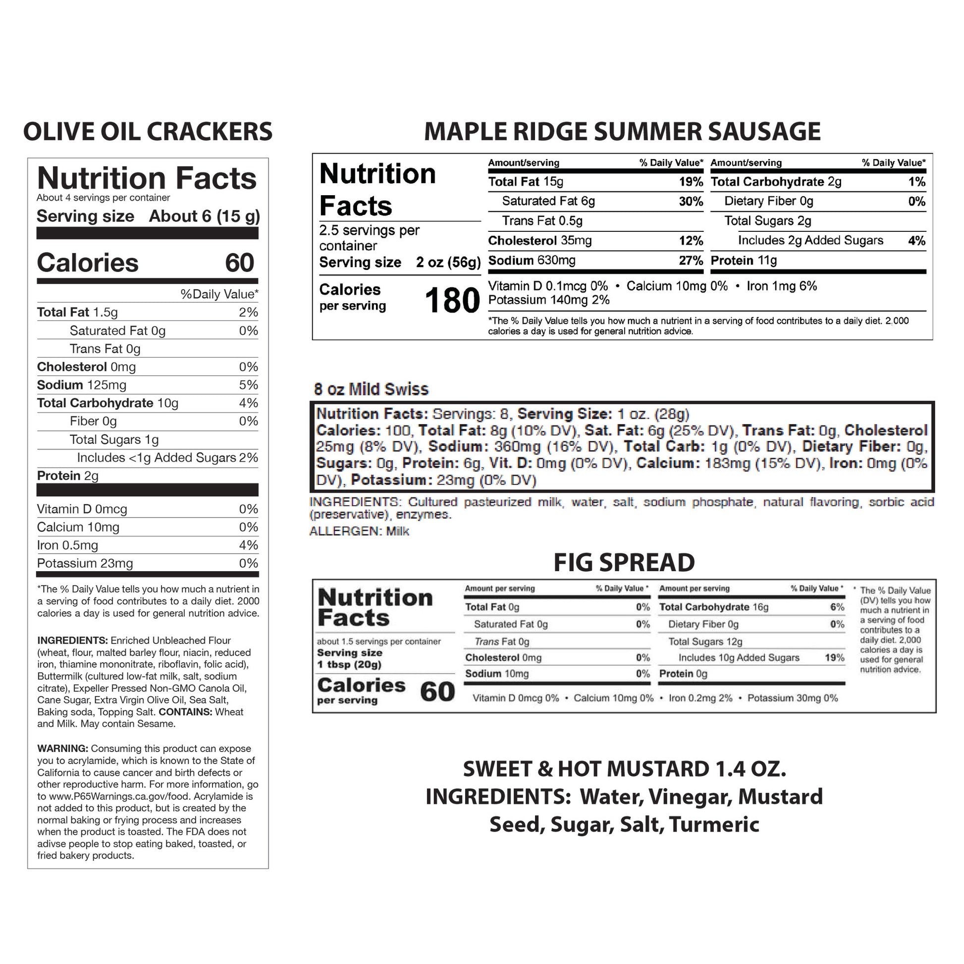 Acacia wood paddle featuring a live bark edge; Handle with natural twine rope; Each piece features a unique raw wood finish; Reversible Charcuterie board; 18 in x 8 in x 0.75 in; Includes a curated Gourmet Gift Pack (packaged in a Small Gift Box for Food - 8" x 6.5" x 3.5") featuring: Maple Ridge Farms - Summer Beef Sausage (5 oz) Maple Ridge Farms - Swiss Cheese (7 oz) Maple Ridge Farms - Olive Oil & Sea Salt Crackers (2 oz) Maple Ridge Farms - Sweet & Hot Mustard (1.4 oz) Divina - Fig Spread (1.05 oz)