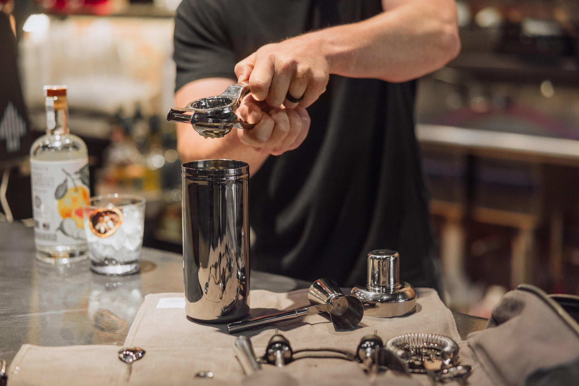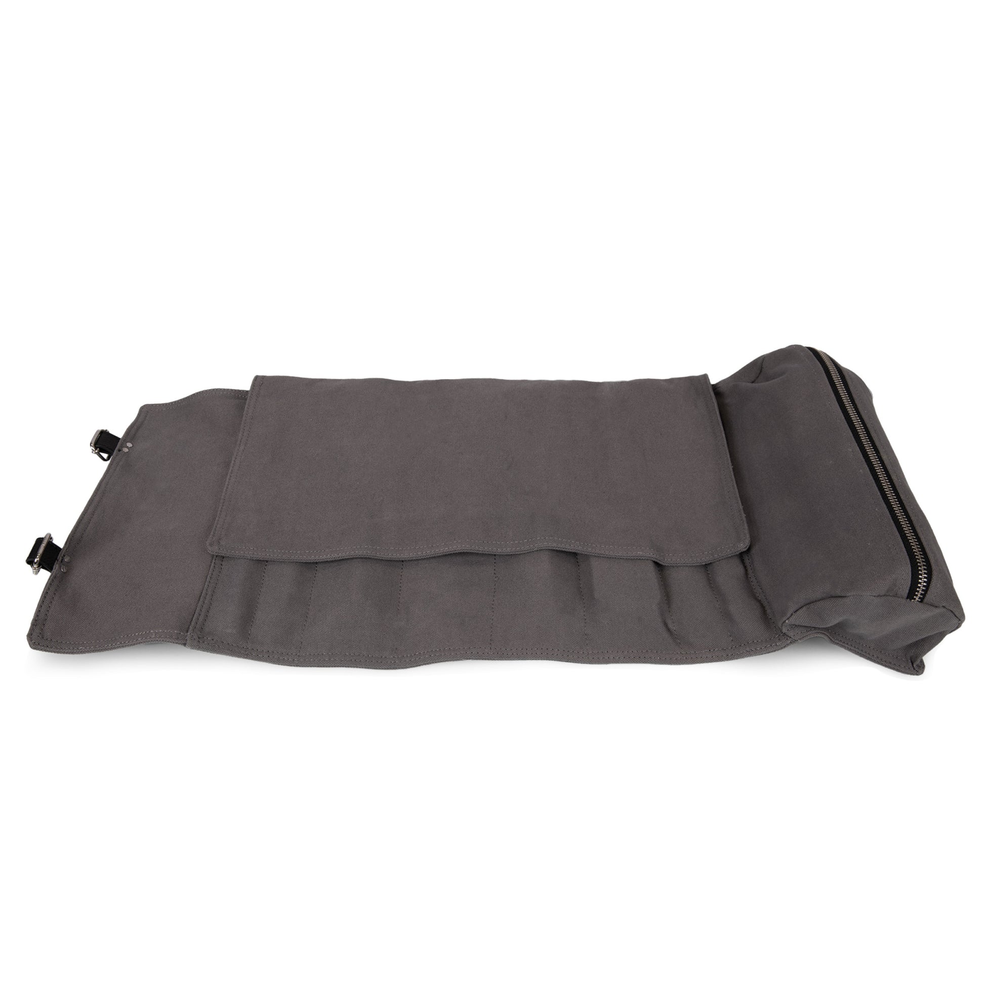 Soft cotton canvas carry pouch with vegan leather strap; Stainless steel bar tools include: Stir Spoon, Juicer, Tongs, Muddler, Strainer, Wine Key, Jigger, Bottle Opener, Shaker, and 2 Pour Spouts.