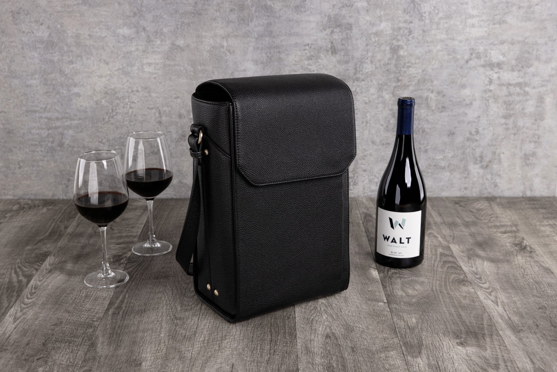 Insulated tote; Holds two 750ml bottles; Leatherette shell; Brass coated stainless steel hardware; Magnetic closure; Accessory pocket.