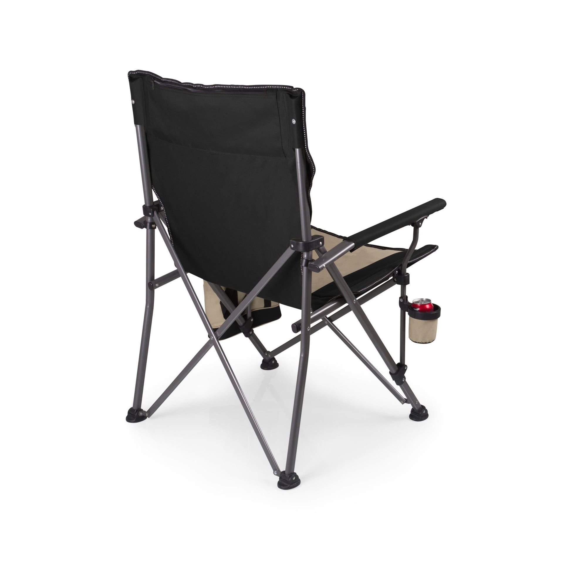 Steel frame with hinged feet for stability on uneven terrain; Maximum weight capacity, 500 lbs.; Cooler (11.25" x 3.25" x 9.75") holds up to nine 12-oz. cans; Retractable cup holder attached to chair frame; Zippered security pocket on back of headrest
