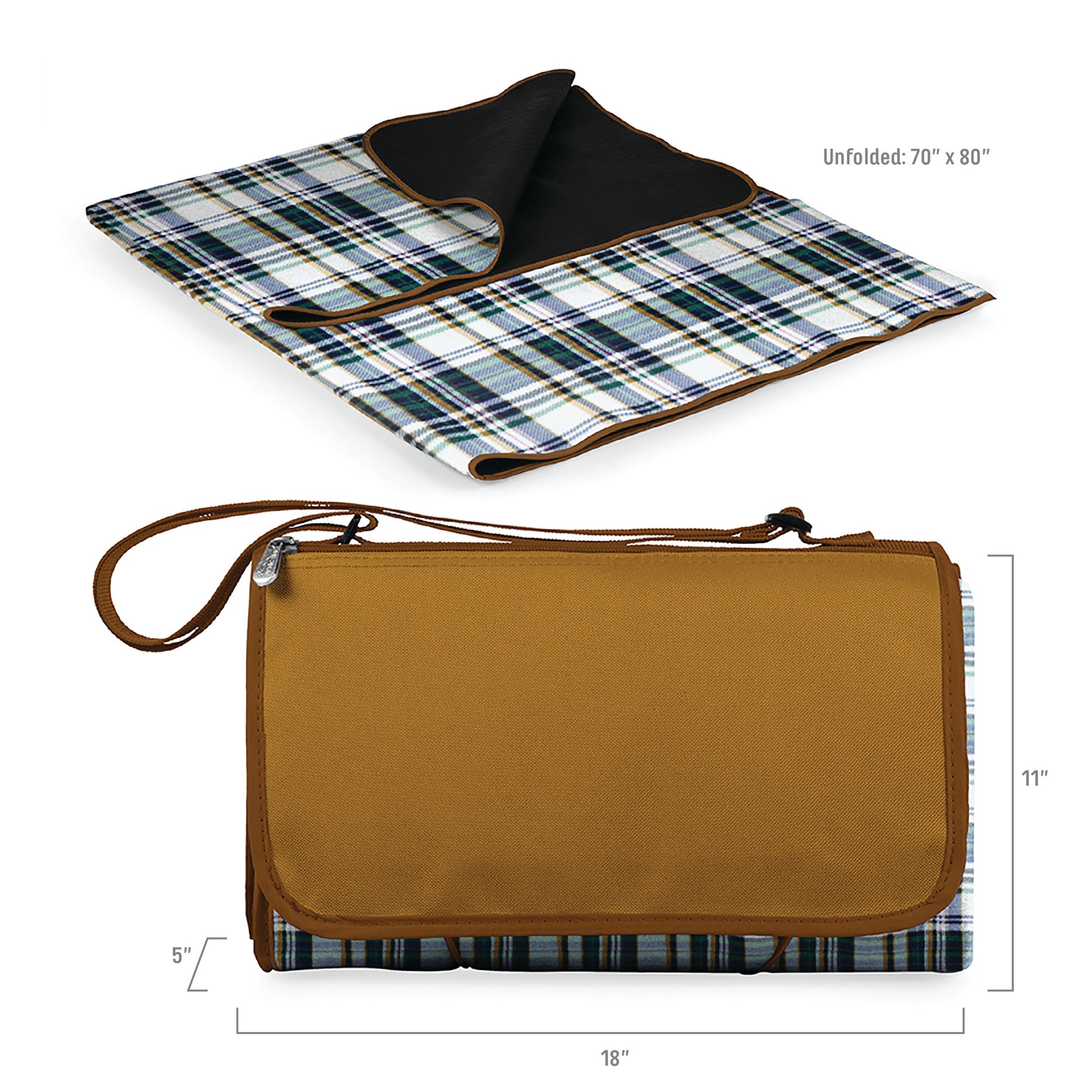 Nearly 39 square feet of seating area; 70" x 80" inch picnic blanket allows for a spacious seating area; Water-resistant underside shields you from damp grass and cleans up easily; Soft fleece (140 gsm) topside for comfort; Folds into a compact carry tote with shoulder strap; Has a security pocket on the flap of the folded tote