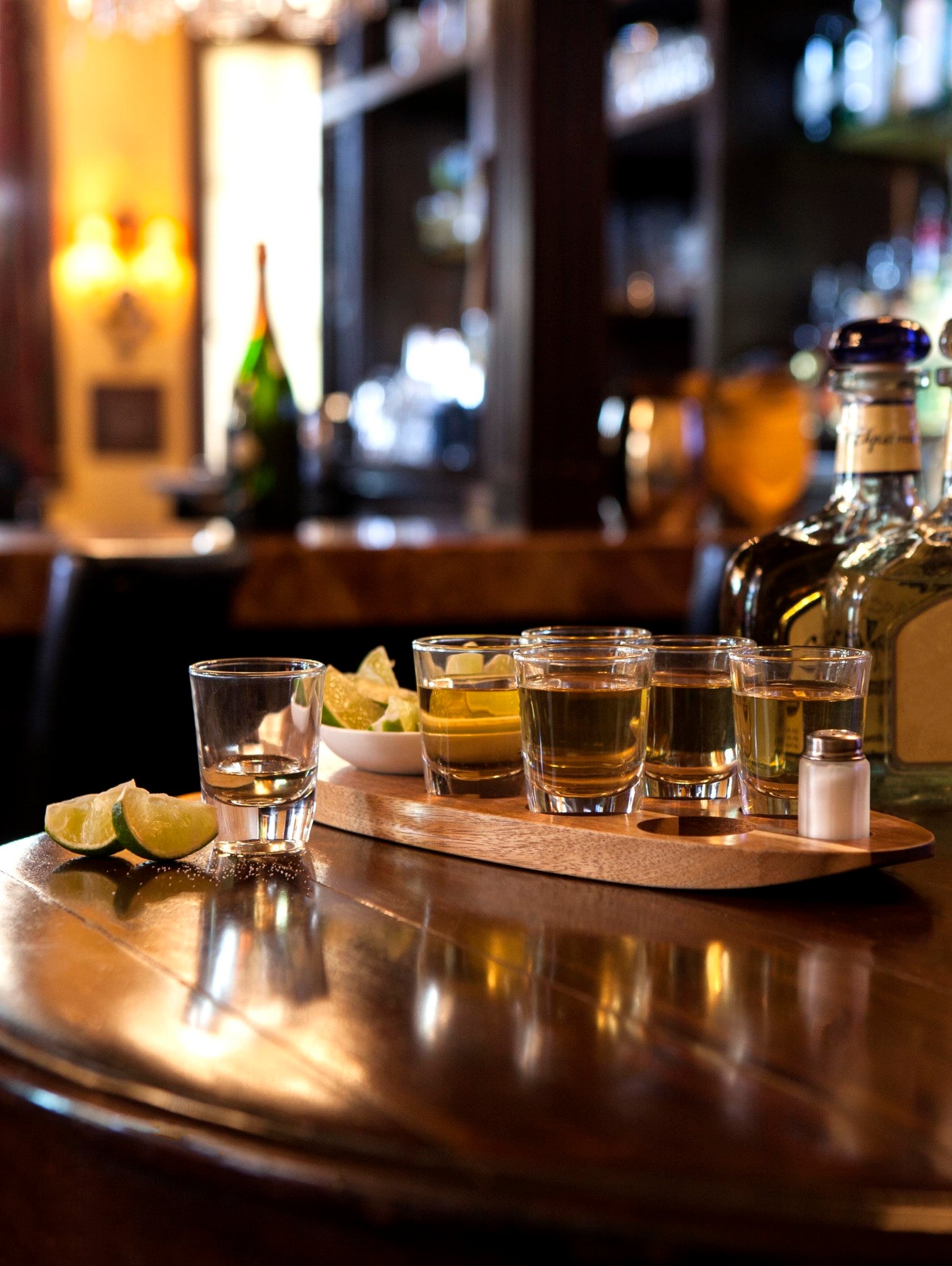 Viva Tequila with the Cantinero Shot Glass Set with Tray, a handsome dark acacia cocktail serving tray specifically carved to hold the included six heavy-bottom shot glasses, ceramic dish for lime slices, and frosted-glass salt shaker with chromed steel lid.