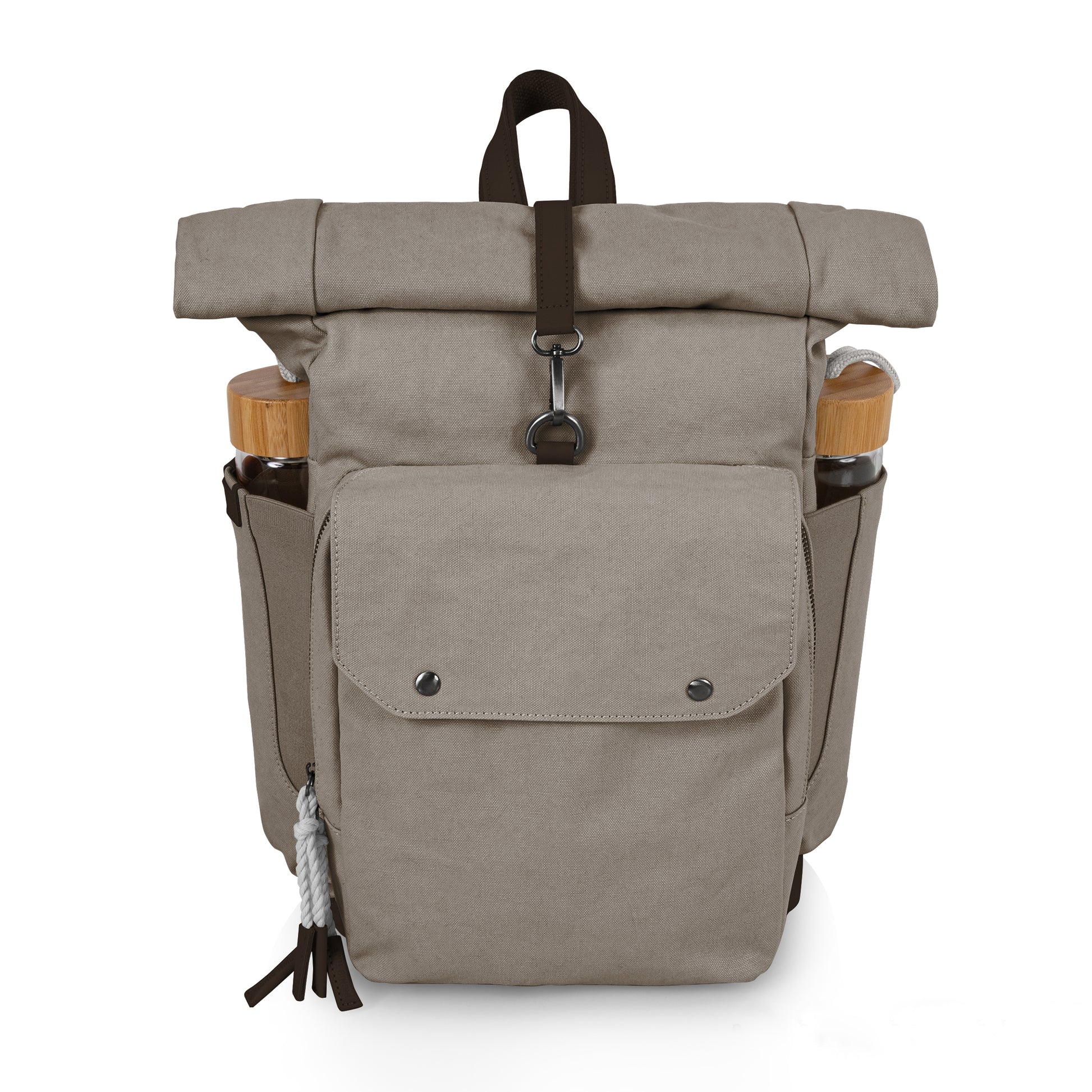 The Carmel Roll Top Picnic Backpack Cooler brings together a certified recycled Cotton canvas exterior with a waterproof, insulated, eco-friendly interior to create one stylish and functional package. But wait - that’s not all! The component pocket in this soft cooler bag includes two sets of stainless steel utensils, two recycled plant fiber plates and two glass water bottles with bamboo lids. The roll top provides even more space for snacks and drinks, and the durable bottom helps keep everything in this outdoor cooler dry.