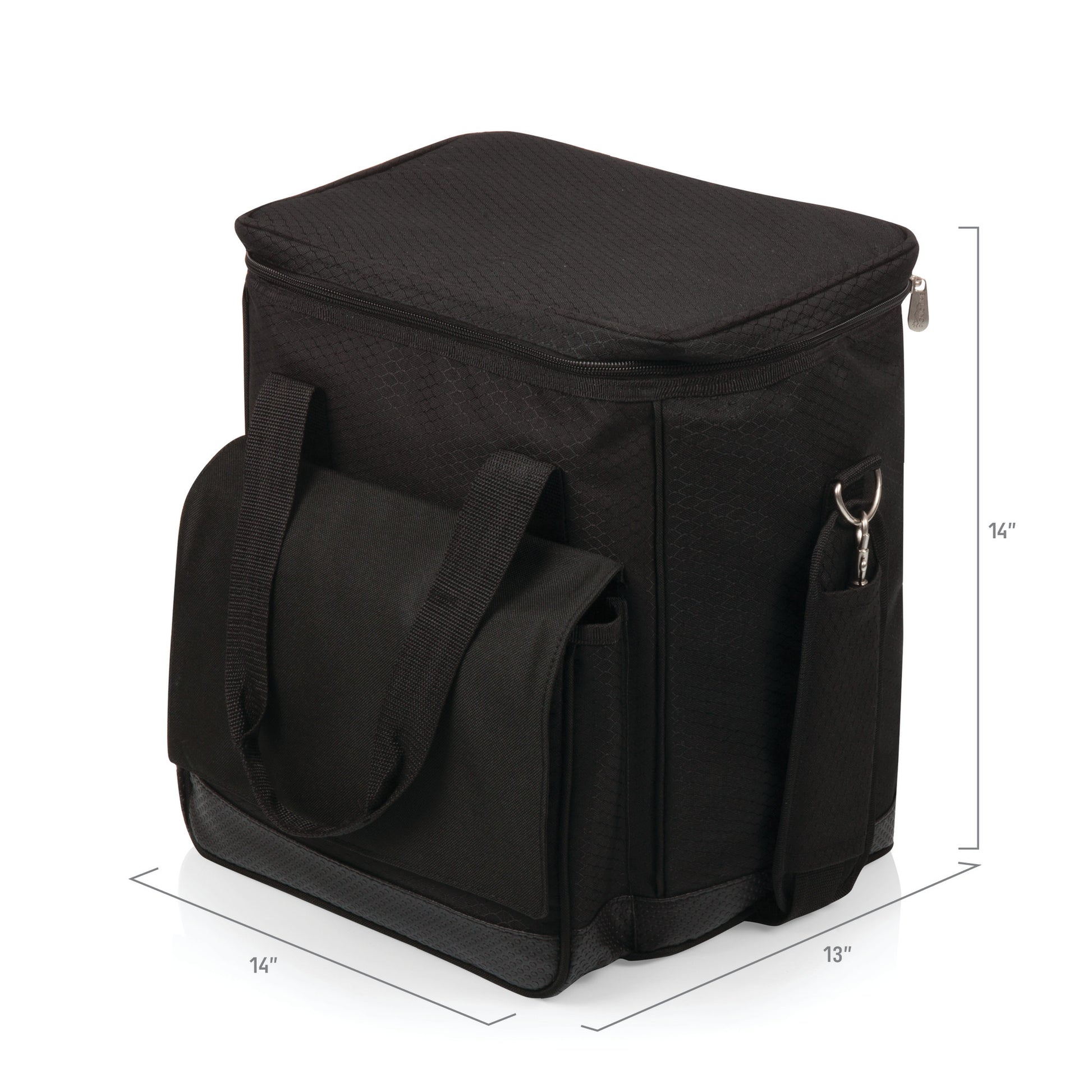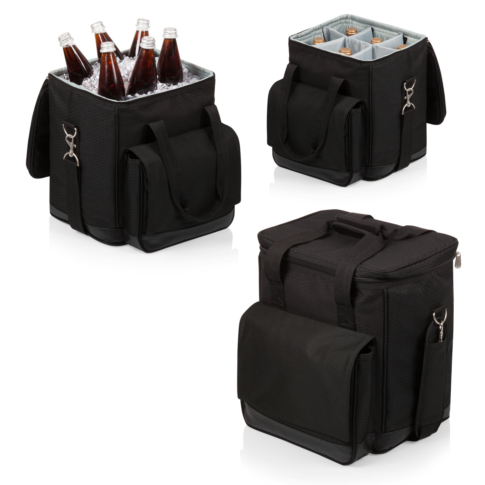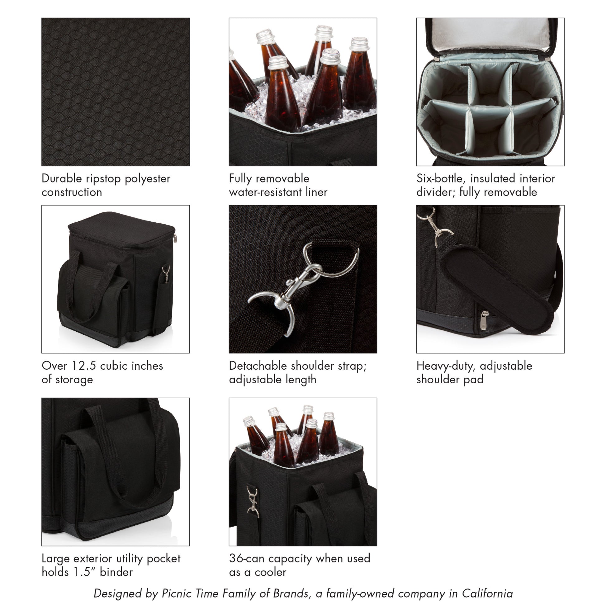 Durable ripstop polyester exterior with a water-resistant PVC base; Padded, removable interior dividers. Removable water-resistant interior lining. Can be used as a cooler or a 6-bottle wine carrier; Fully-insulated interior; Adjustable shoulder strap with movable pad for utmost comfort; ThermoGuard insulation and a pearlized foil lid help keep your wine or food cool for hours; An extra large gusseted pocket, located on the front exterior, provides added storage for your valuables or other food items