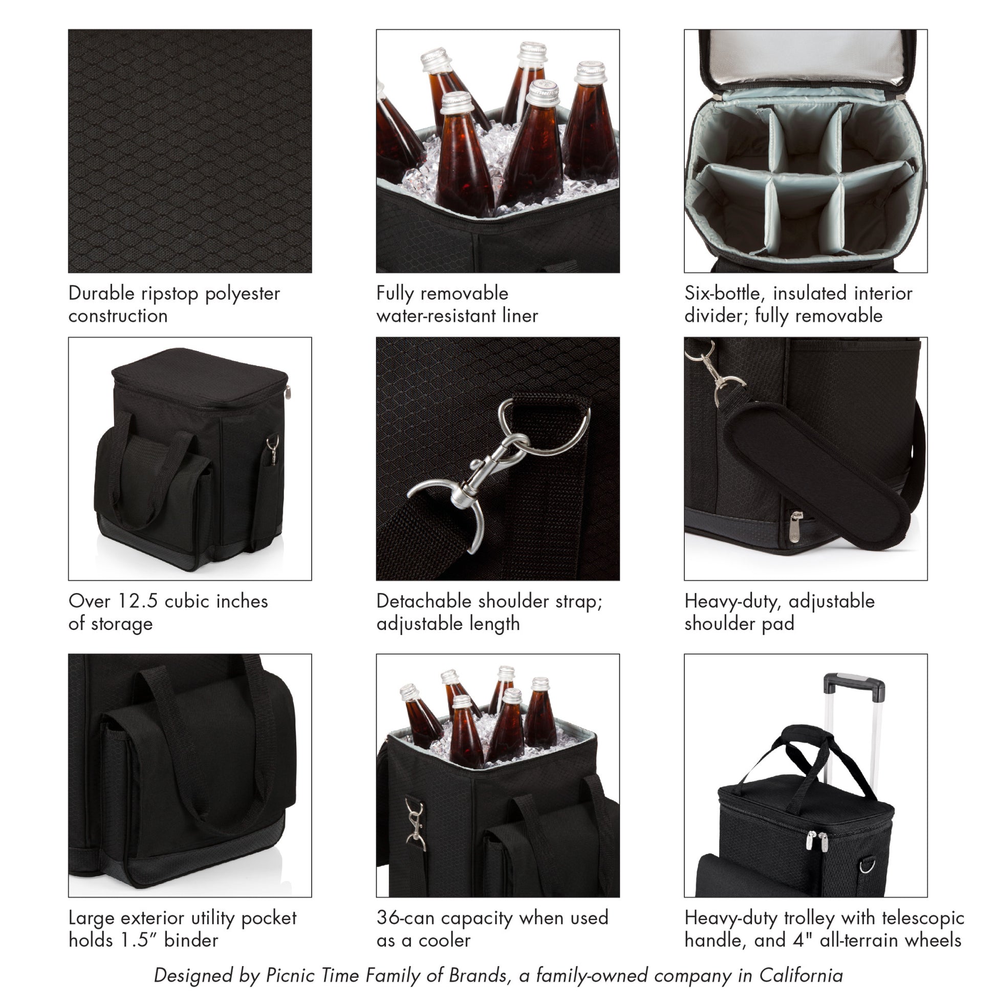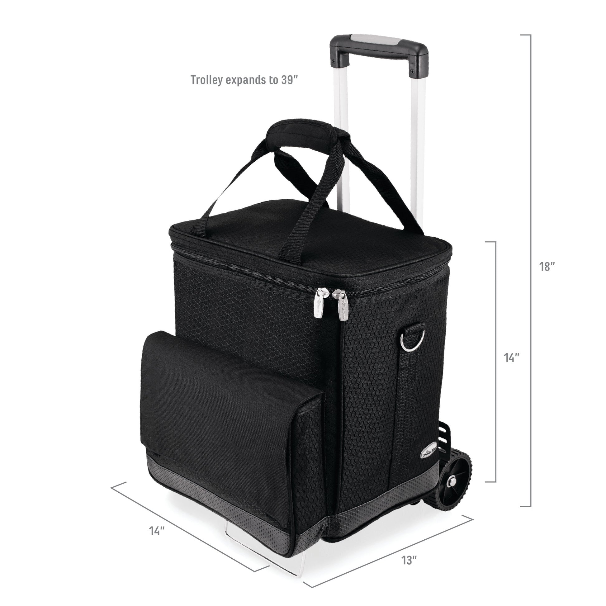 Chromed, heavy-duty trolley with telescopic handle, push-button release and 4" all-terrain wheels, is 39" tall when fully erected, 18" when folded (77 lb. capacity); Durable ripstop polyester exterior with a water-resistant PVC base; Padded, removable interior dividers; Removable water-resistant interior lining; Can be used as a cooler or a 6-bottle wine carrier; Fully-insulated interior; Adjustable shoulder strap with movable pad for utmost comfort; ThermoGuard insulation and a pearlized foil lid help keep your wine or food cool for hours; An extra large gusseted pocket, located on the front exterior, provides added storage for your valuables or other food items