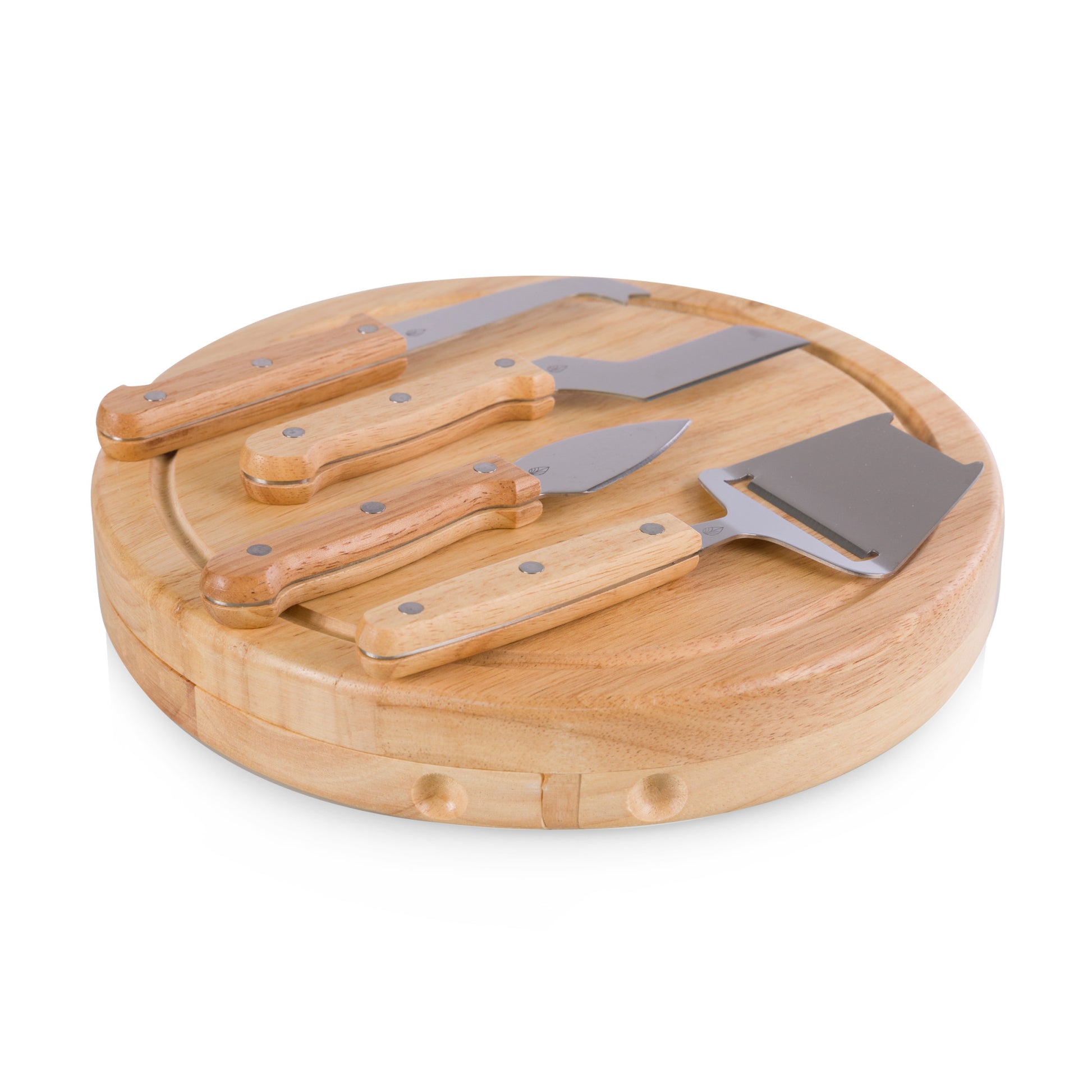 Made of eco-friendly parawood; The board swivels open to reveal four stainless steel cheese tools with parawood handles; Over 81 square inches of cutting surface; Recessed juice groove along the board's top edge will catch cheese brine or juice from cut fruit