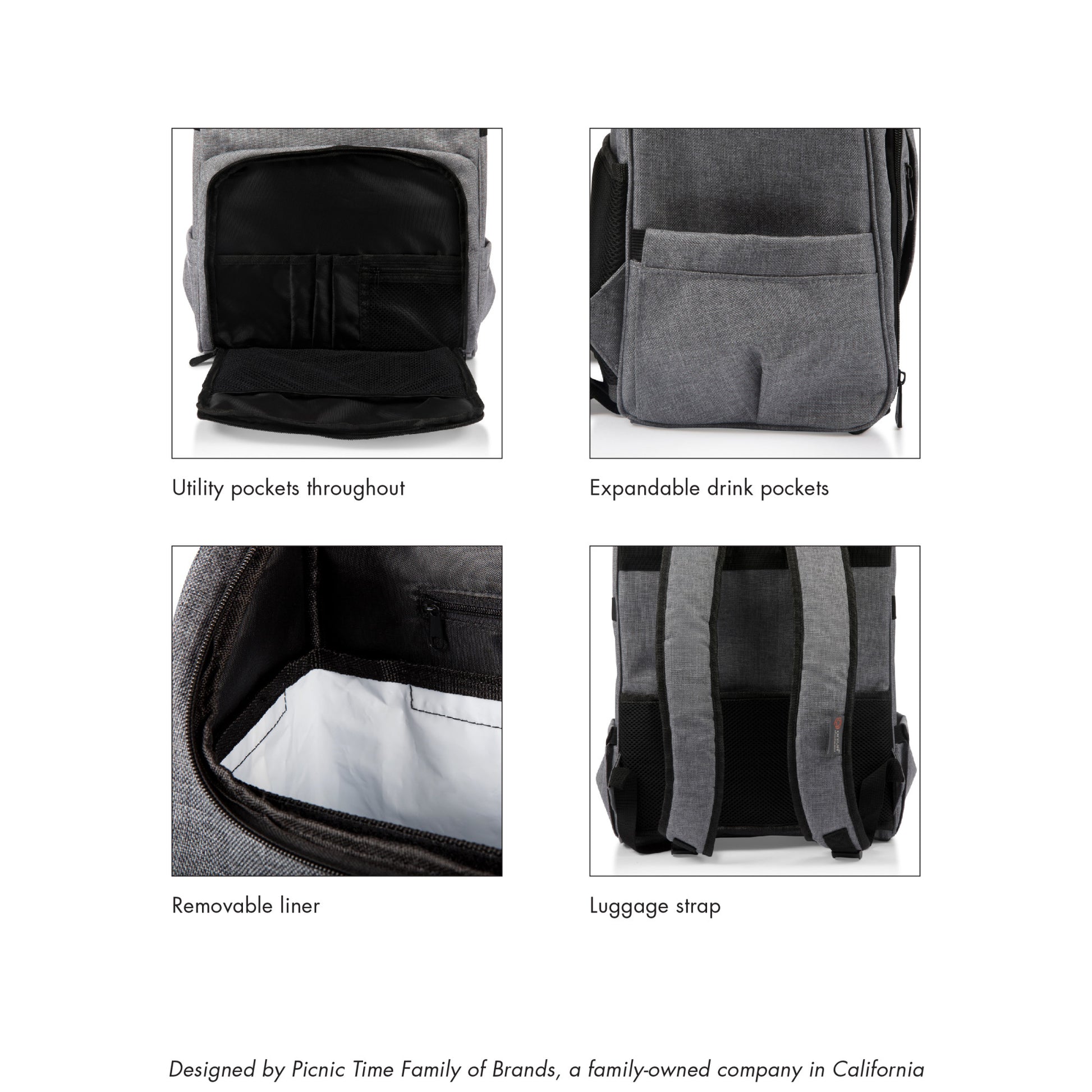 Polyester exterior with adjustable padded shoulder straps and carry handle; Luggage strap for securing to rolling suitcase; Large heat-sealed insulated interior compartment with removable liner; Zippered and mesh storage compartments