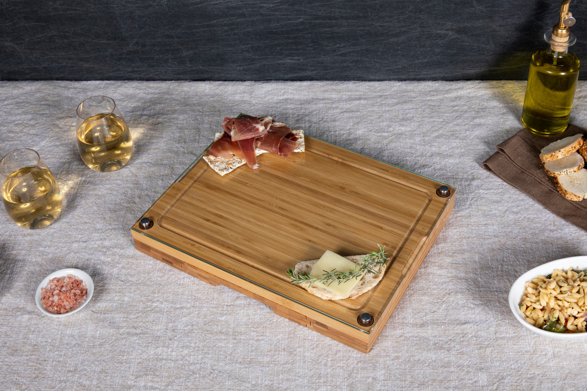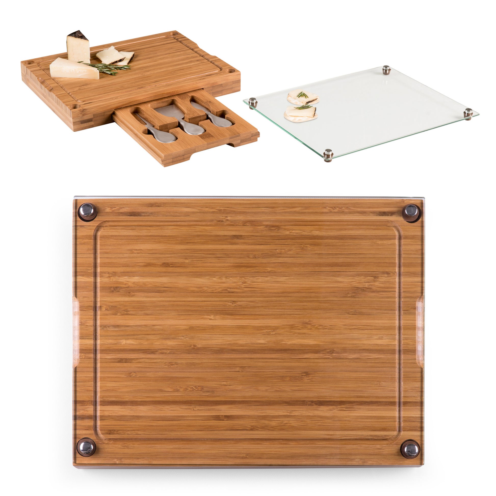 Bamboo board has over 128 square inches of cutting surface; Three stainless steel cheese tools; Removable tempered glass serving tray fits snugly on cutting board and can also be lifted off of board and used as a second surface for cutting or serving