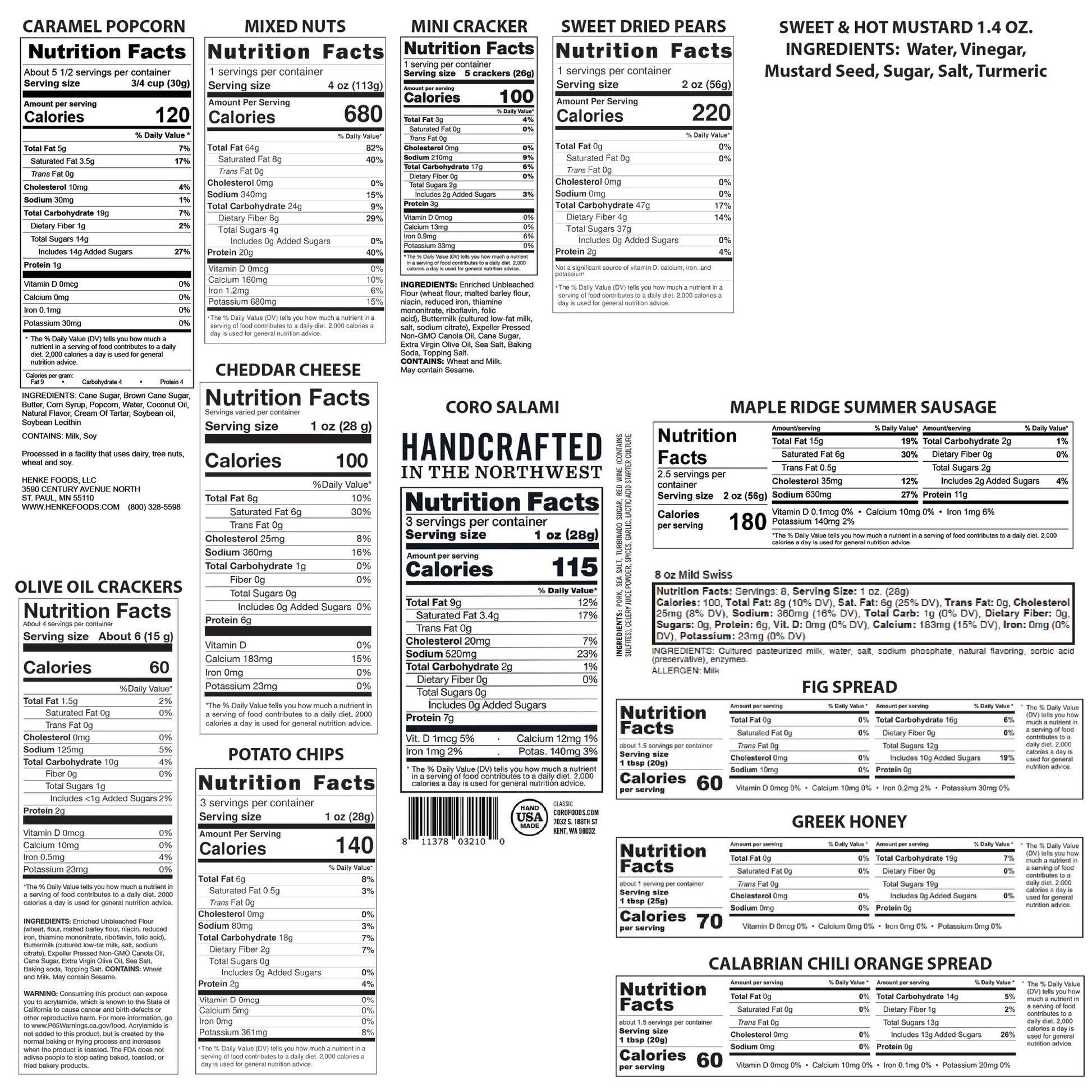 Split-lid design for dual entry; Wooden lid provides level surface for drink and food; Liner is machine washable; Includes a generous Gourmet Gift Pack featuring: Maple Ridge Farms - Summer Beef Sausage (5 oz) Coro - Sliced Pack Uncured Classic Salami (3 oz) Maple Ridge Farms - Swiss Cheese (7 oz) Northwoods Food and Gift Enterprises - Cheddar Cheese (2 oz) Maple Ridge Farms - Olive Oil & Sea Salt Crackers (2 oz) Jocelyn & Co - Sea Salt Crackers (0.9 oz) Jocelyn & Co - Potato Chips (15 oz) Jocelyn & Co - Mixed Nuts (3.75 oz) Maple Ridge Farms - Sweet & Hot Mustard (1.4 oz) Divina - Honey (1.05 oz) Divina - Fig Spread (1.05 oz) Divina - Chili Orange Spread (1.05 oz) Jocelyn & Co - Dried Pear (2.2 oz) Annie B's - Popcorn Original Carmel (6 oz)
