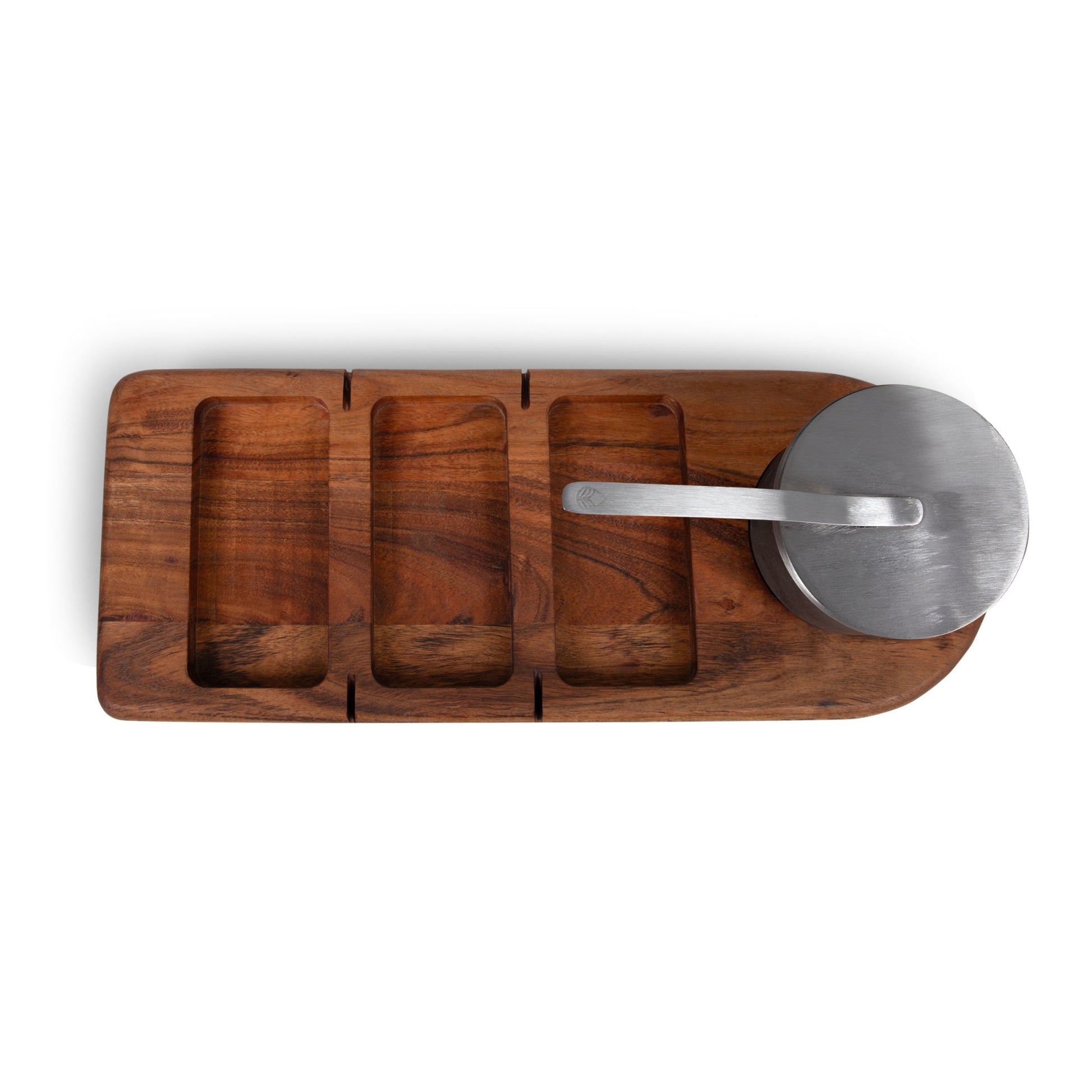 Acacia Wood Board; 4 Acacia Wood Skewers; 1 Concrete Fire Pit; 1 Stainless Steel Tamper; 16.93" x 6.7"x 6.7"; Made in India