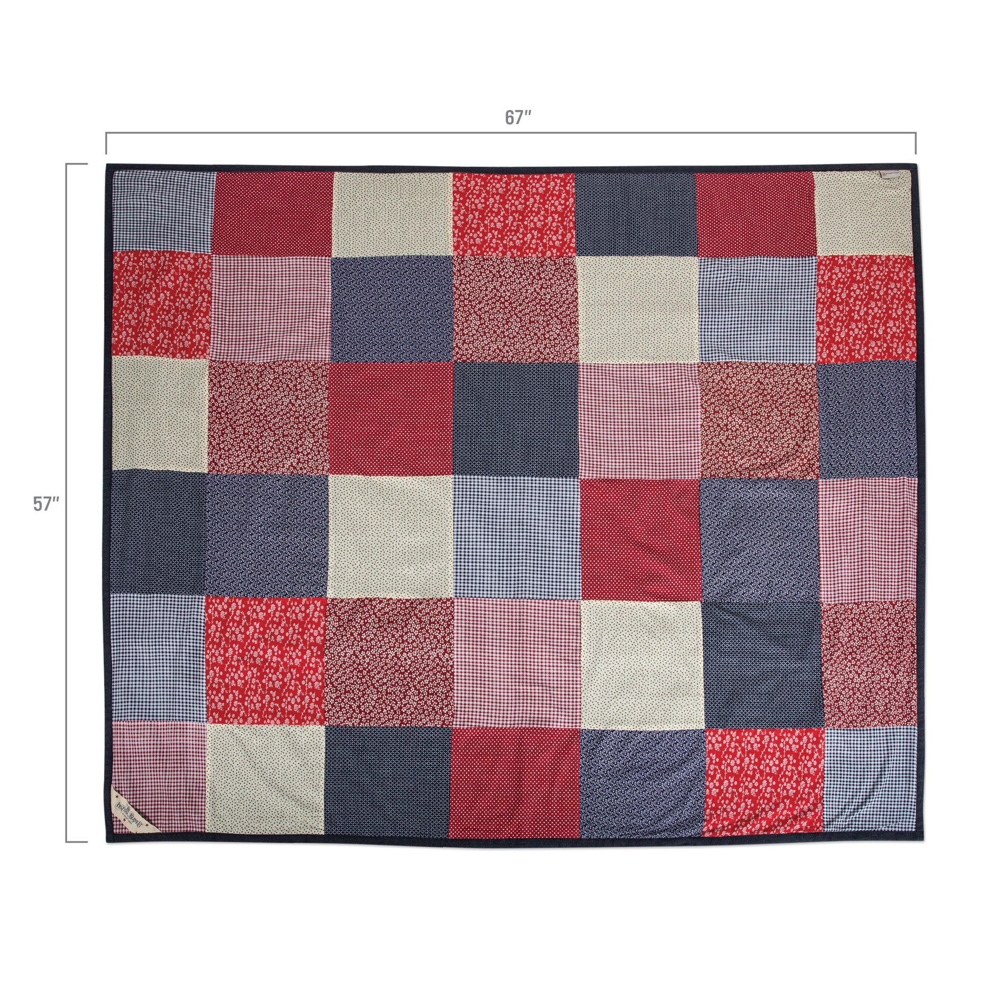 57" x 67"; Machine wash cold and tumble dry low; Cotton patchwork blanket with solid denim underside; Each blanket is handmade; fabric patterns and pattern placement may vary. Color scheme of mostly red, white and blue will remain the same