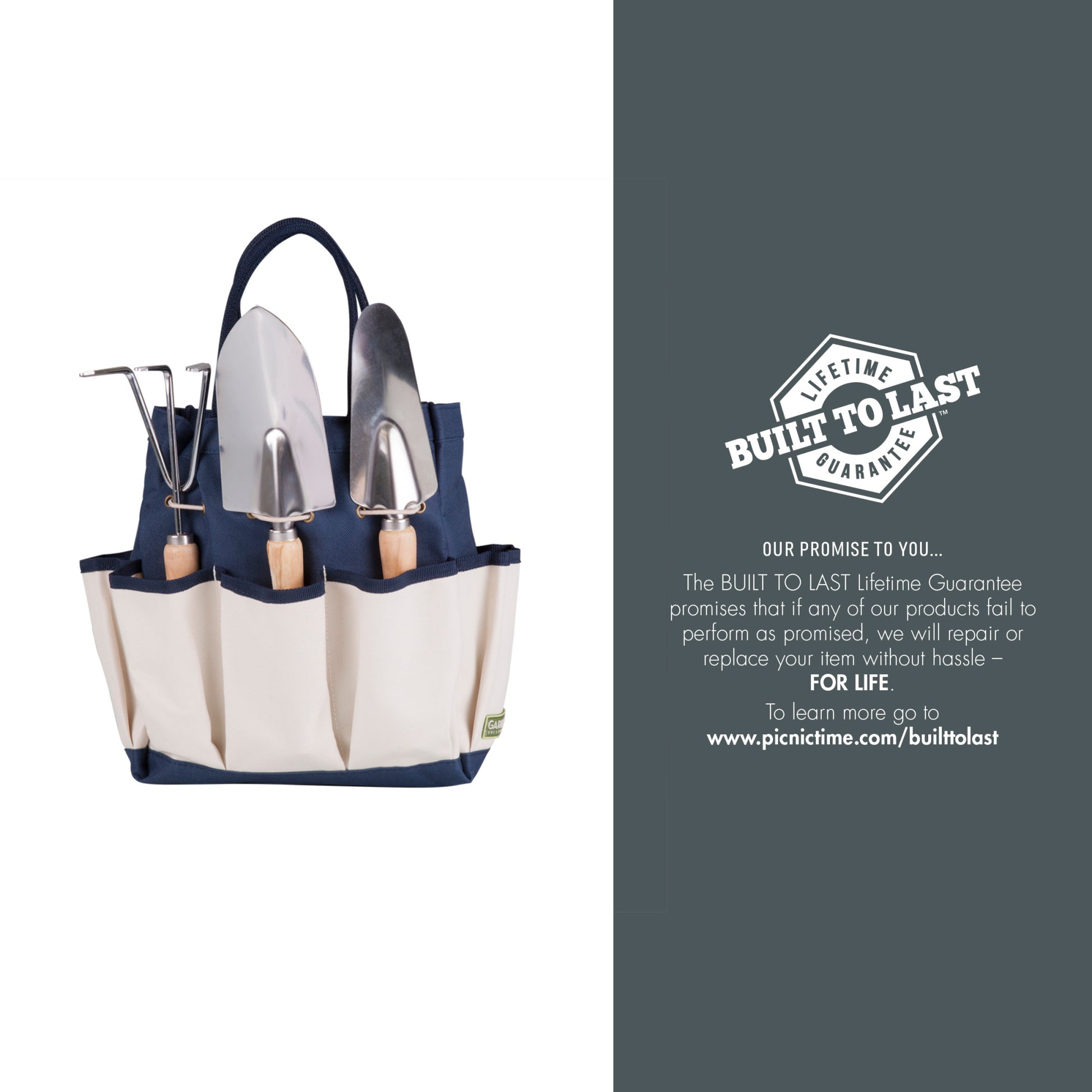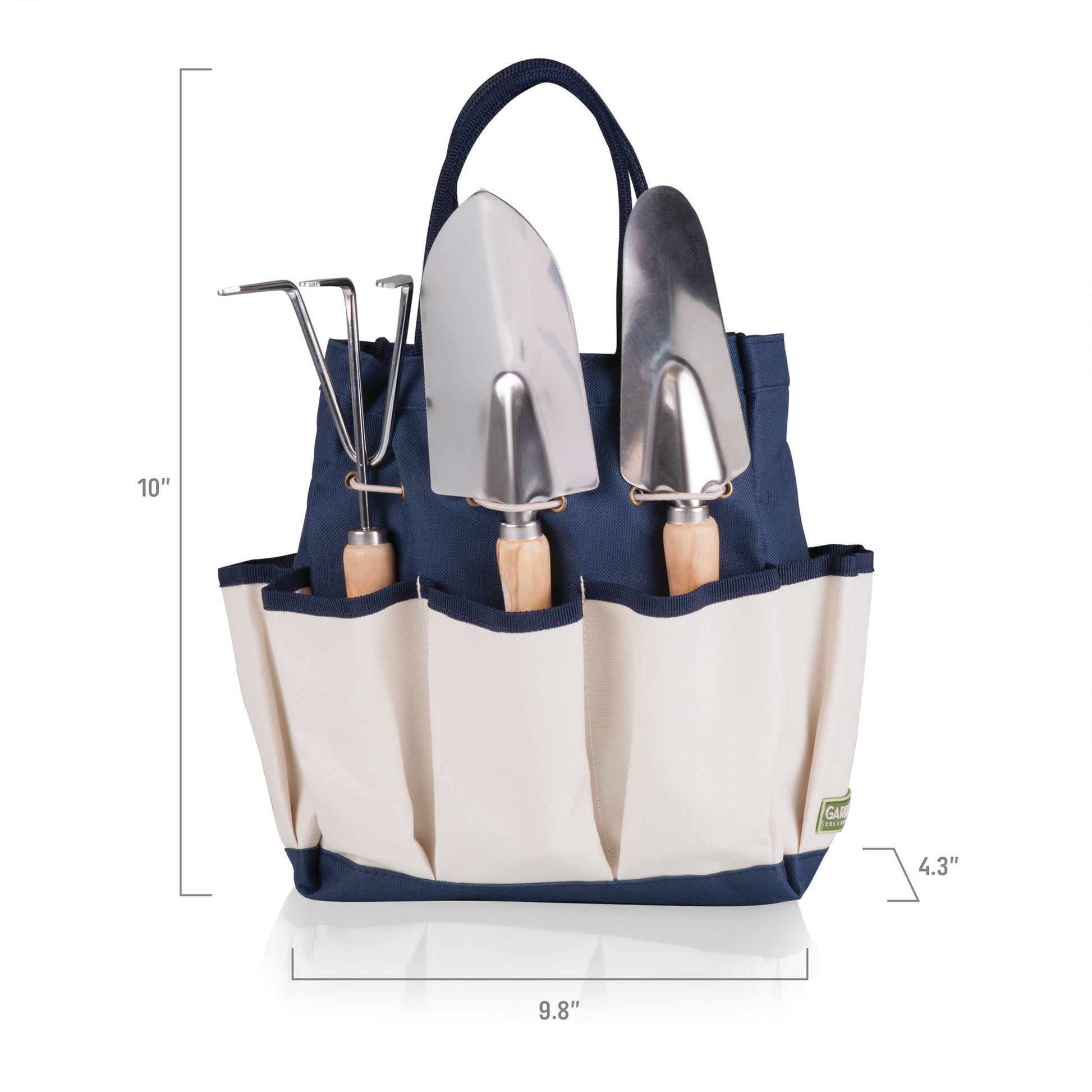 3 Steel Garden Tools (Broad Face Trowel, Narrow Face Trowel, Cultivator/Hand Rake) with wooden handles; Durable 600D polyester exterior construction; Stain-resistant interior; Three exterior pockets for added storage; Tools tucked securely into an exterior pocket; 5.7 dry quart capacity