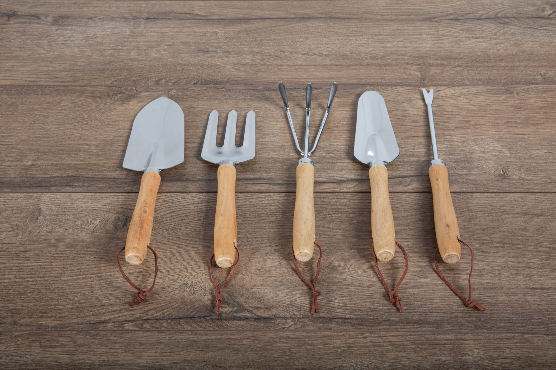 5 Steel gardening tools (Garden Fork, Weeder, Broad Face Trowel, Cultivator/Hand Rake, and Narrow Face Trowel) with wooden handles that feature leather ties; Lightweight and portable; Sturdy steel frame; Tool pockets on the exterior of the storage tote make them readily accessible when sitting in the seat; Storage tote fully detaches from the seat for versatility