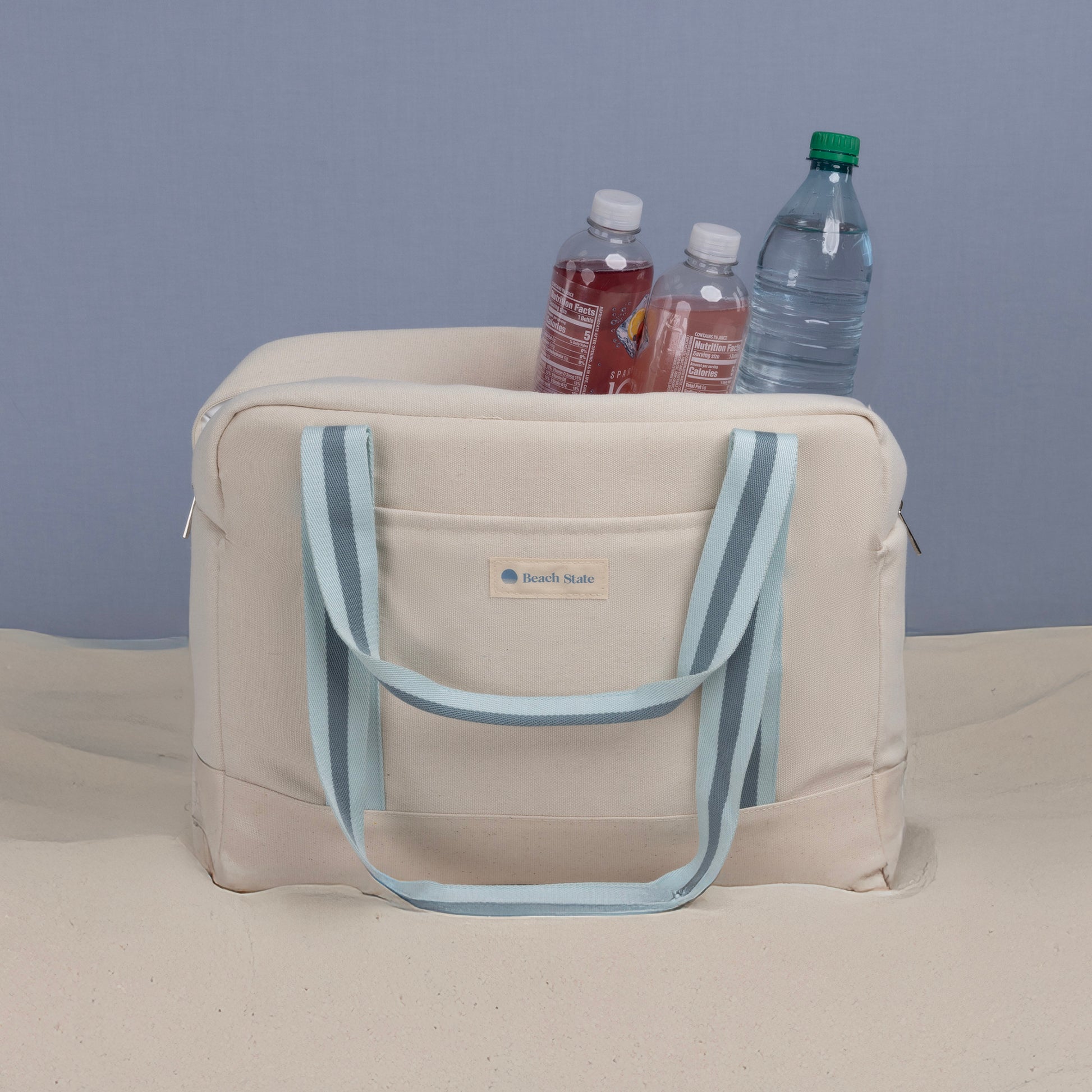 Made from biodegradable cotton; Insulated interior cooler made of biodegradable TPU; Front storage pocket; Two sets of carrying straps; Long straps for over the shoulder and short straps for carrying by hand; 5% of profits donated to the Surfrider Foundation for every Beach State product sold