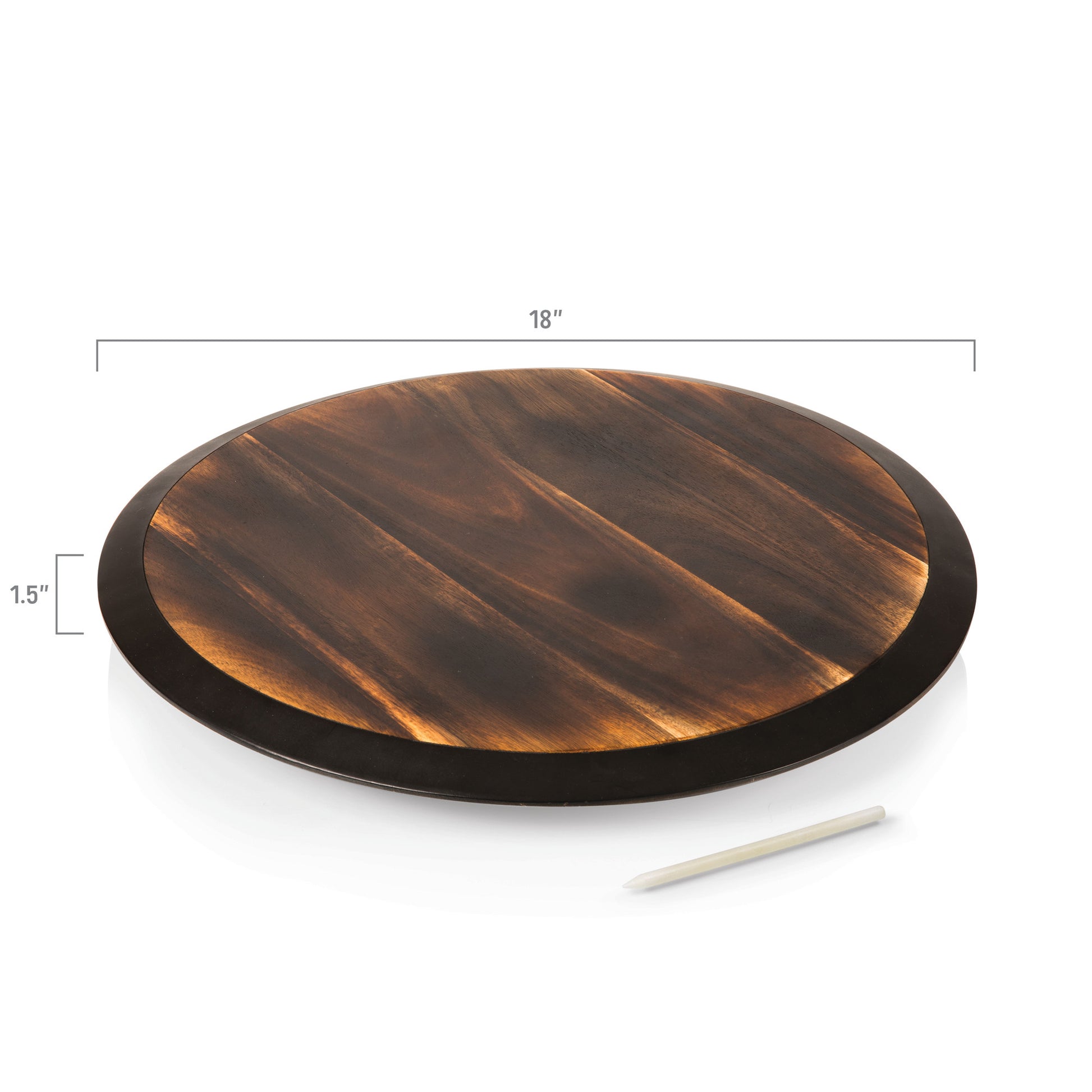 Fired acacia wood with rotating serving surface; Chalkboard edge and soapstone pencil for customization; Measures 18" diameter x 1.5" high