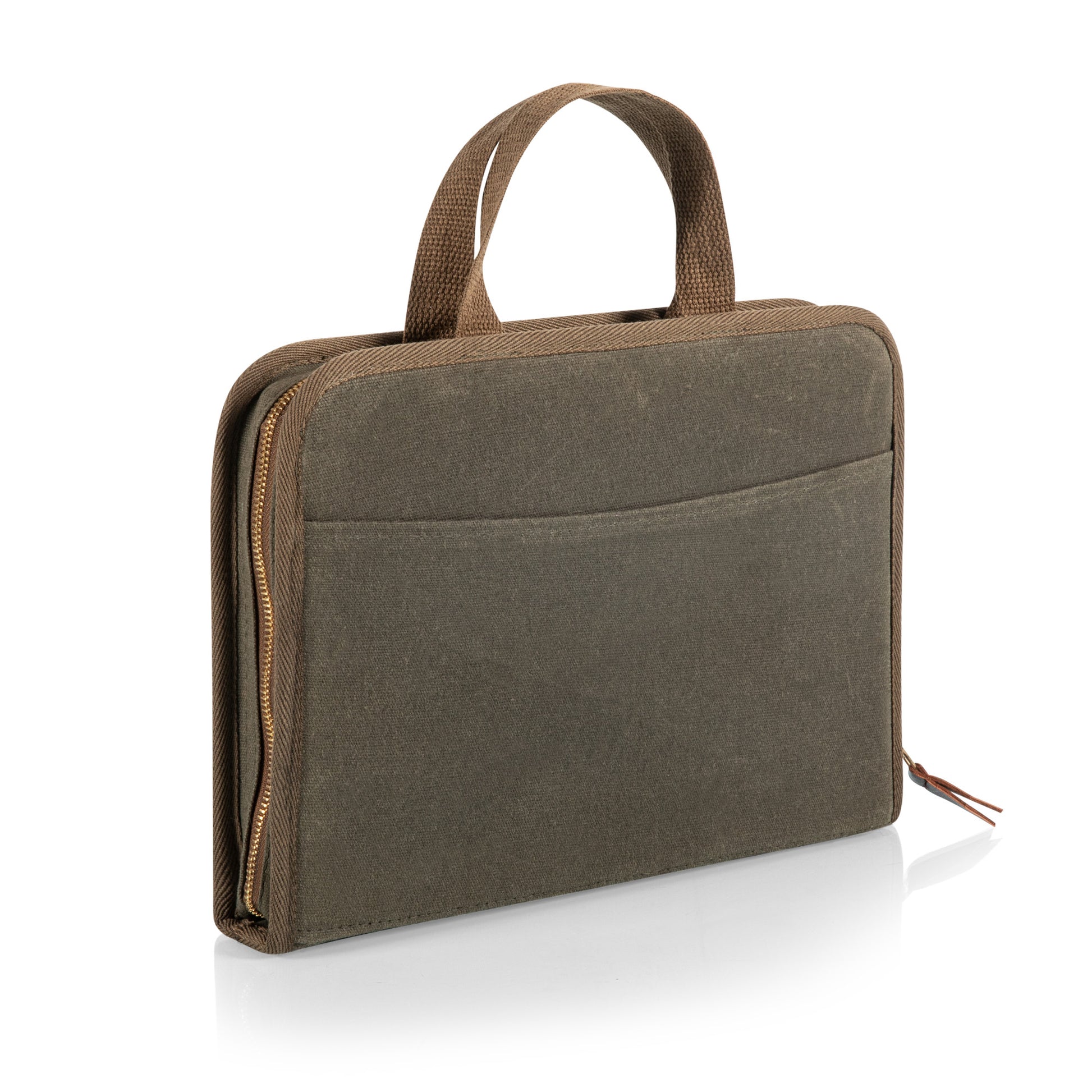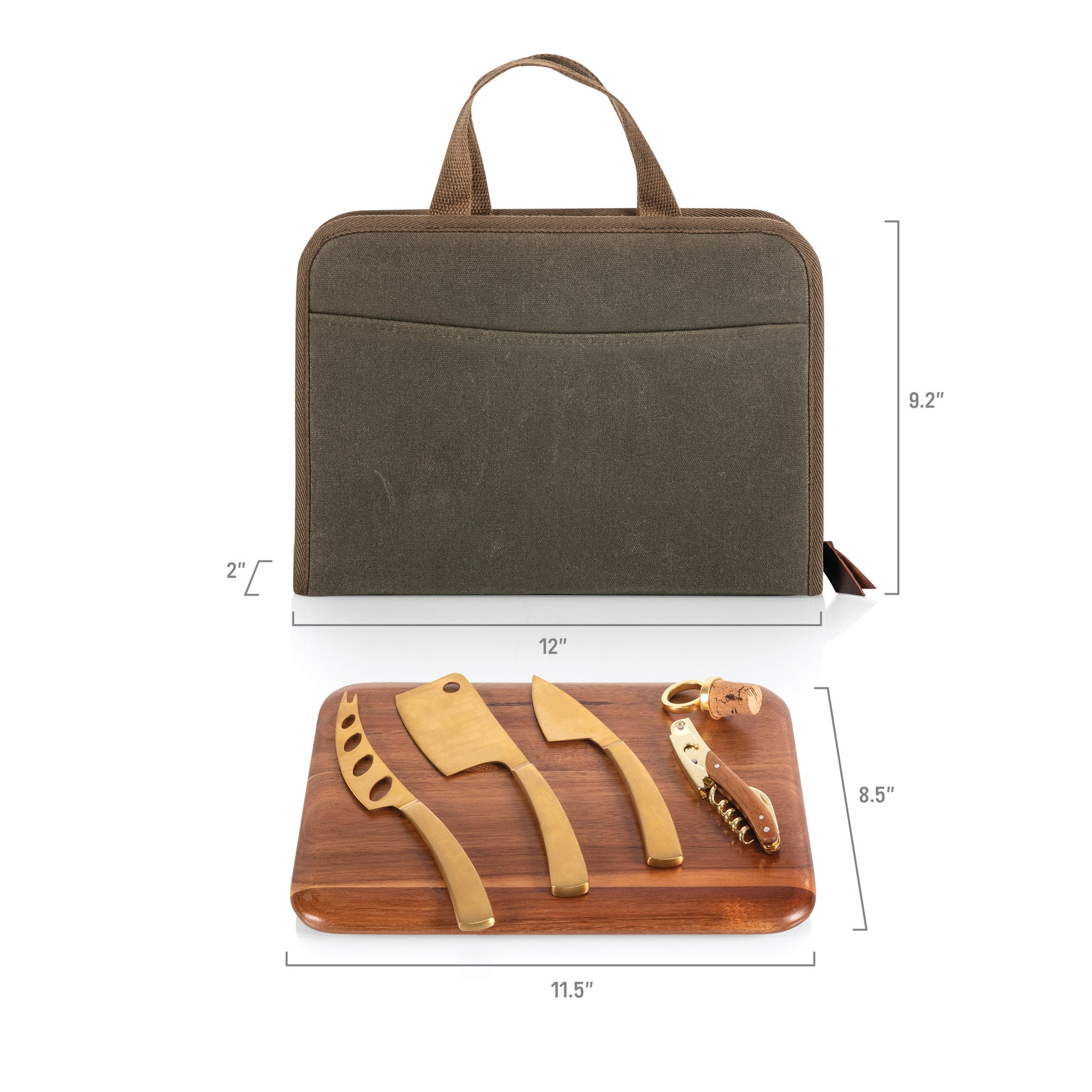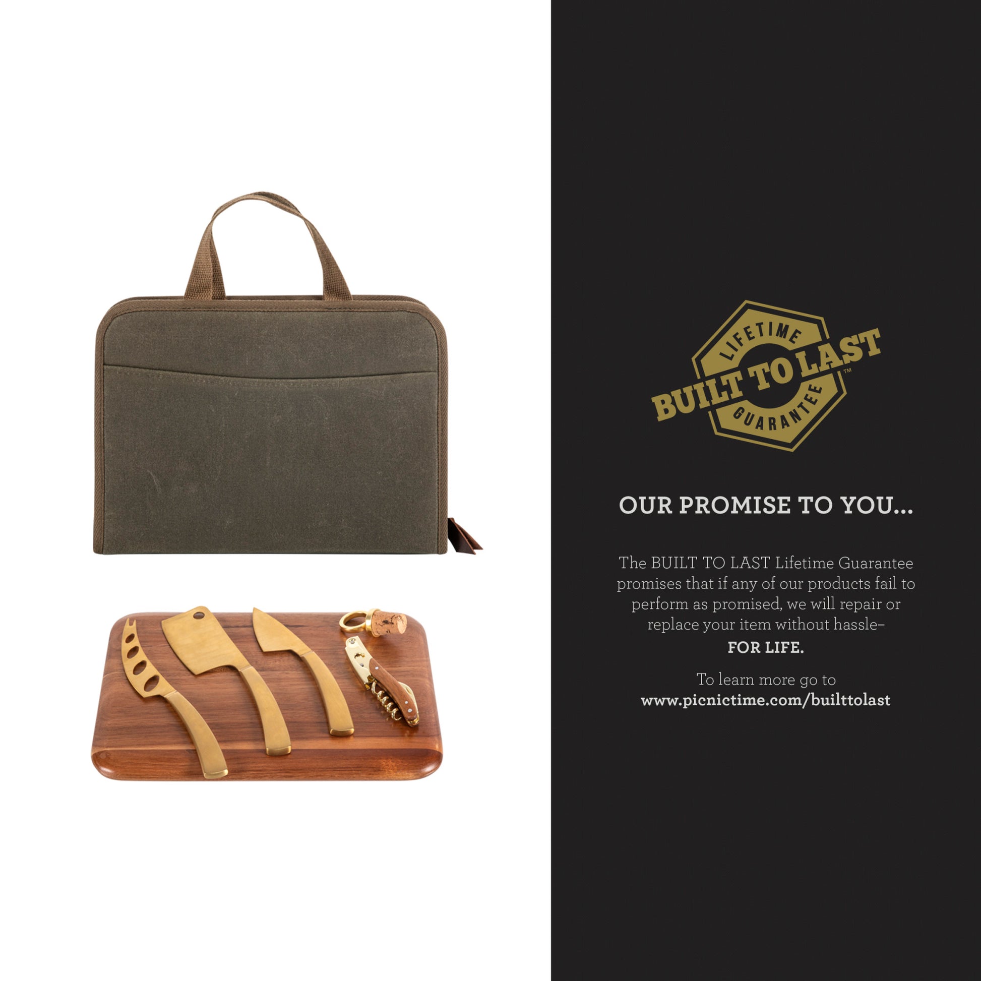Waxed Canvas case with cotton webbing handles; Large front pocket and satin brass-toned zipper; Inside pockets on one side contain solid satin brass-toned cheese and wine tools; cheese cleaver, forked cheese knife, parmesan knife, Waiter-style corkscrew with wood handle, and bottle stopper; Other side has an angled pocket with an Acacia serving board