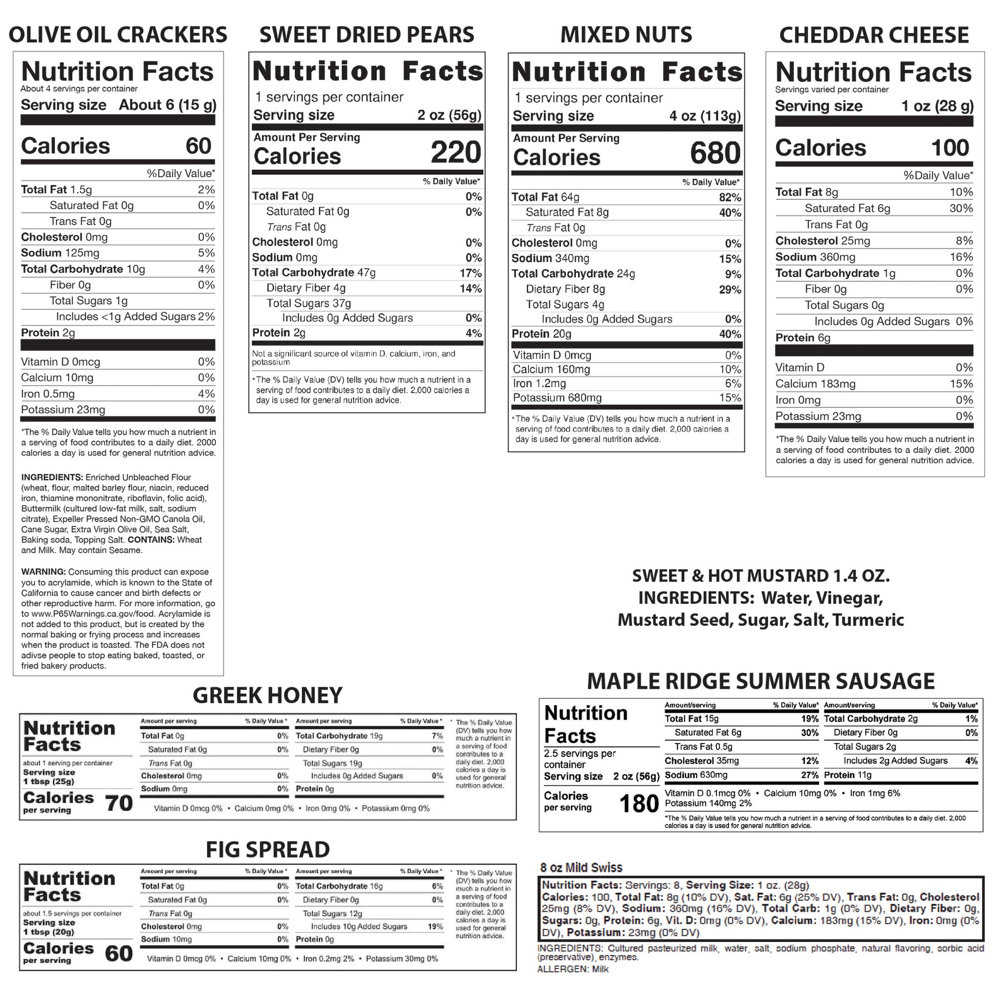 Durable, natural Acacia wood; Juice groove for spill protection; Includes a generous Gourmet Gift Pack (packaged in a Large Gift Box for Food - 14" x 10.5" x 4") featuring: Maple Ridge Farms - Summer Beef Sausage (5 oz) Maple Ridge Farms - Swiss Cheese (7 oz) Northwoods Food and Gift Enterprises - Cheddar Cheese (2 oz) Maple Ridge Farms - Olive Oil & Sea Salt Crackers (2 oz) Jocelyn & Co - Mixed Nuts (3.75 oz) Maple Ridge Farms - Sweet & Hot Mustard (1.4 oz) Divina - Honey (1.05 oz) Divina - Fig Spread (1.05 oz) Jocelyn & Co - Dried Pear (2.2 oz)