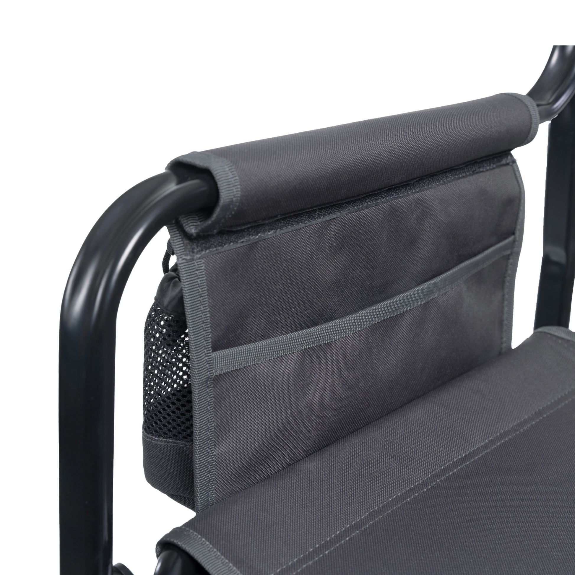 Strong aluminum frame; Breathable mesh fabric; Easy to store and carry; 225 lbs weight capacity; Detachable armrest storage caddy; 24" x 34" x 35.5"