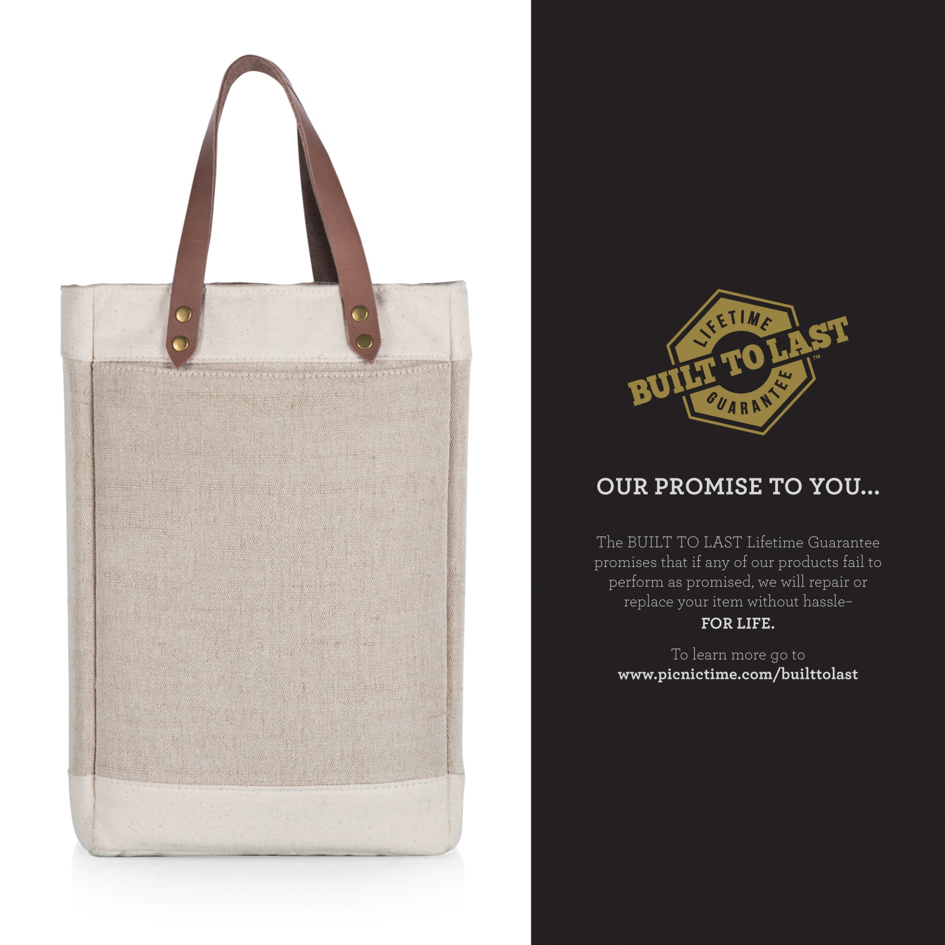 Picture yourself entering the party with two fabulous bottles of wine securely held in this rustic-chic insulated wine tote. It’s a very nice picture.