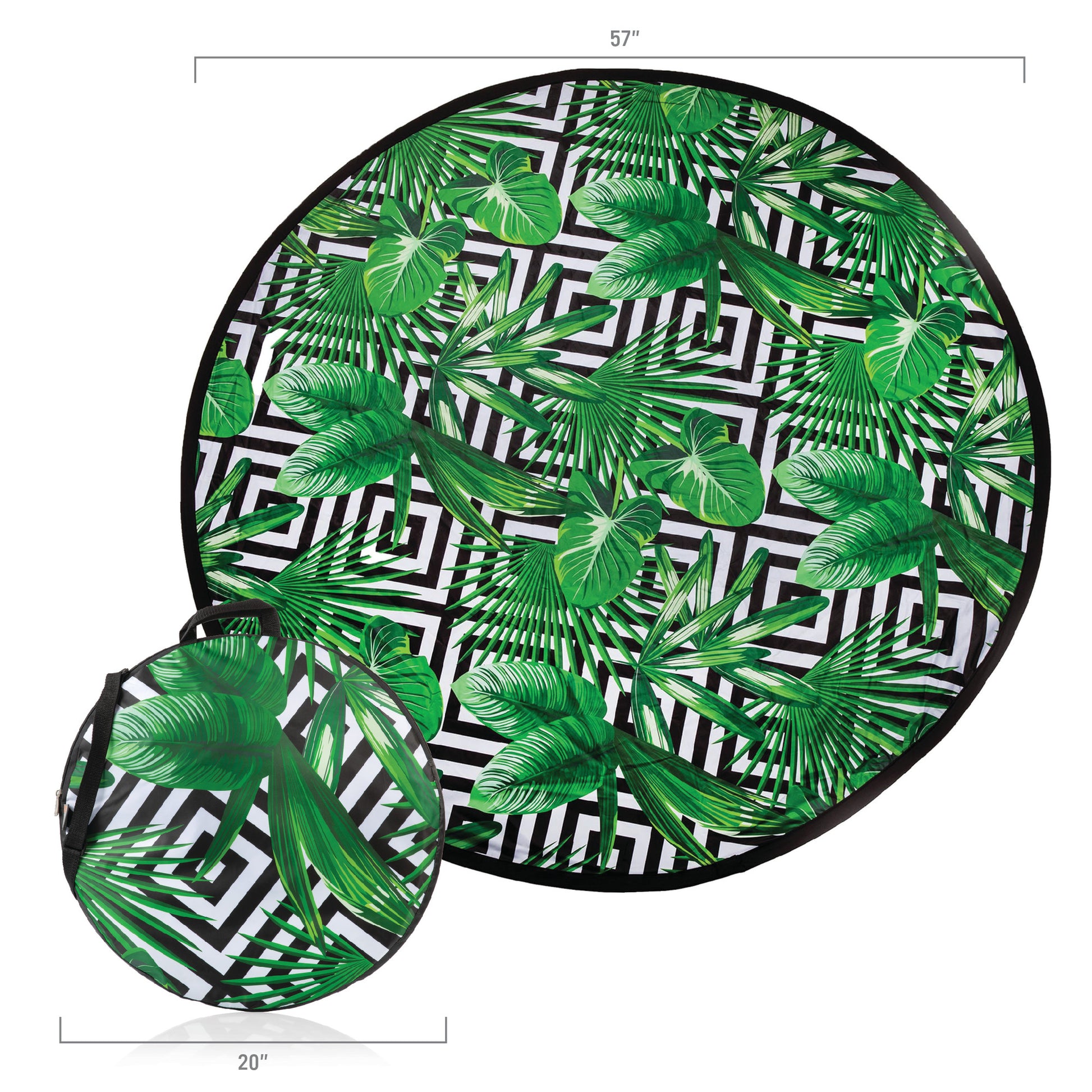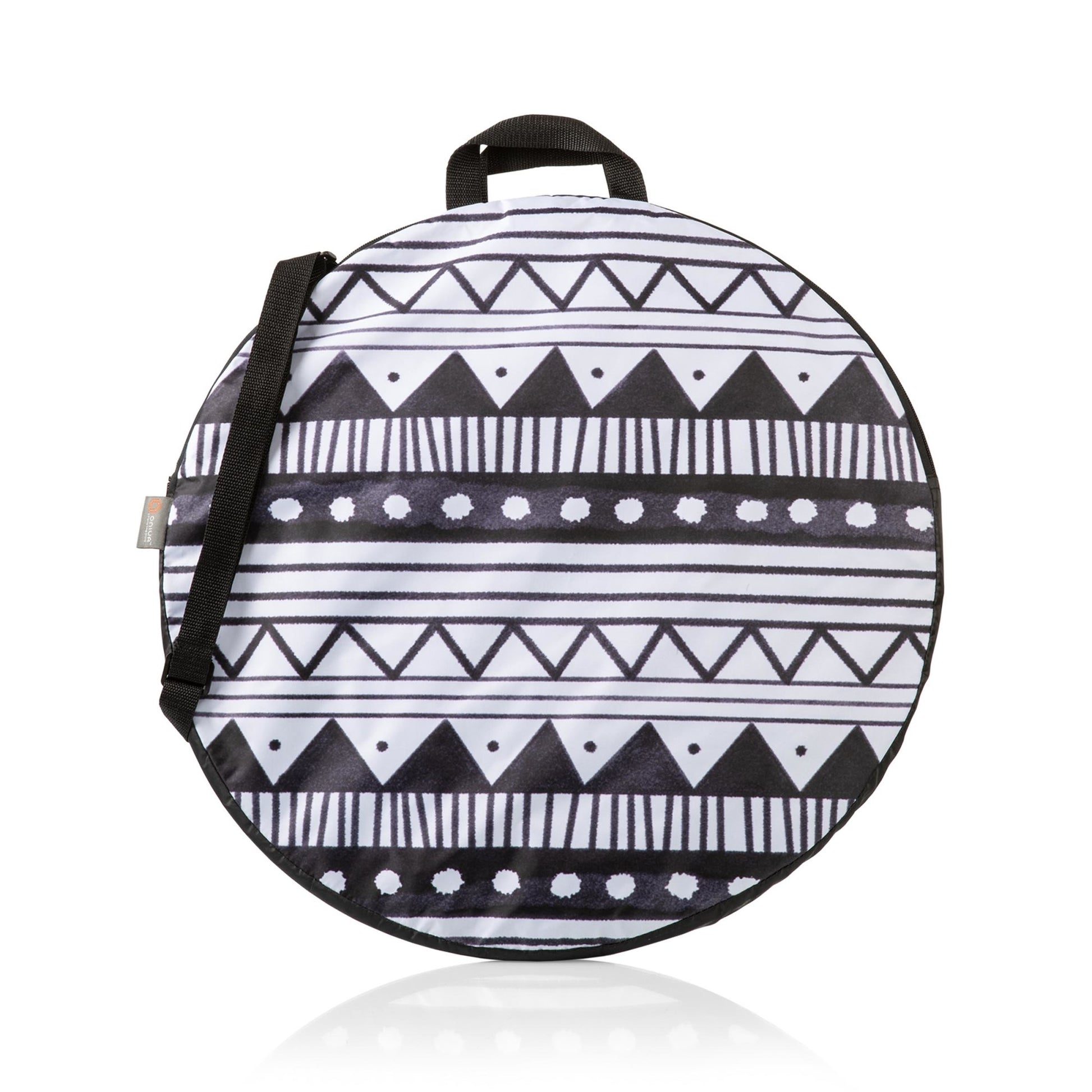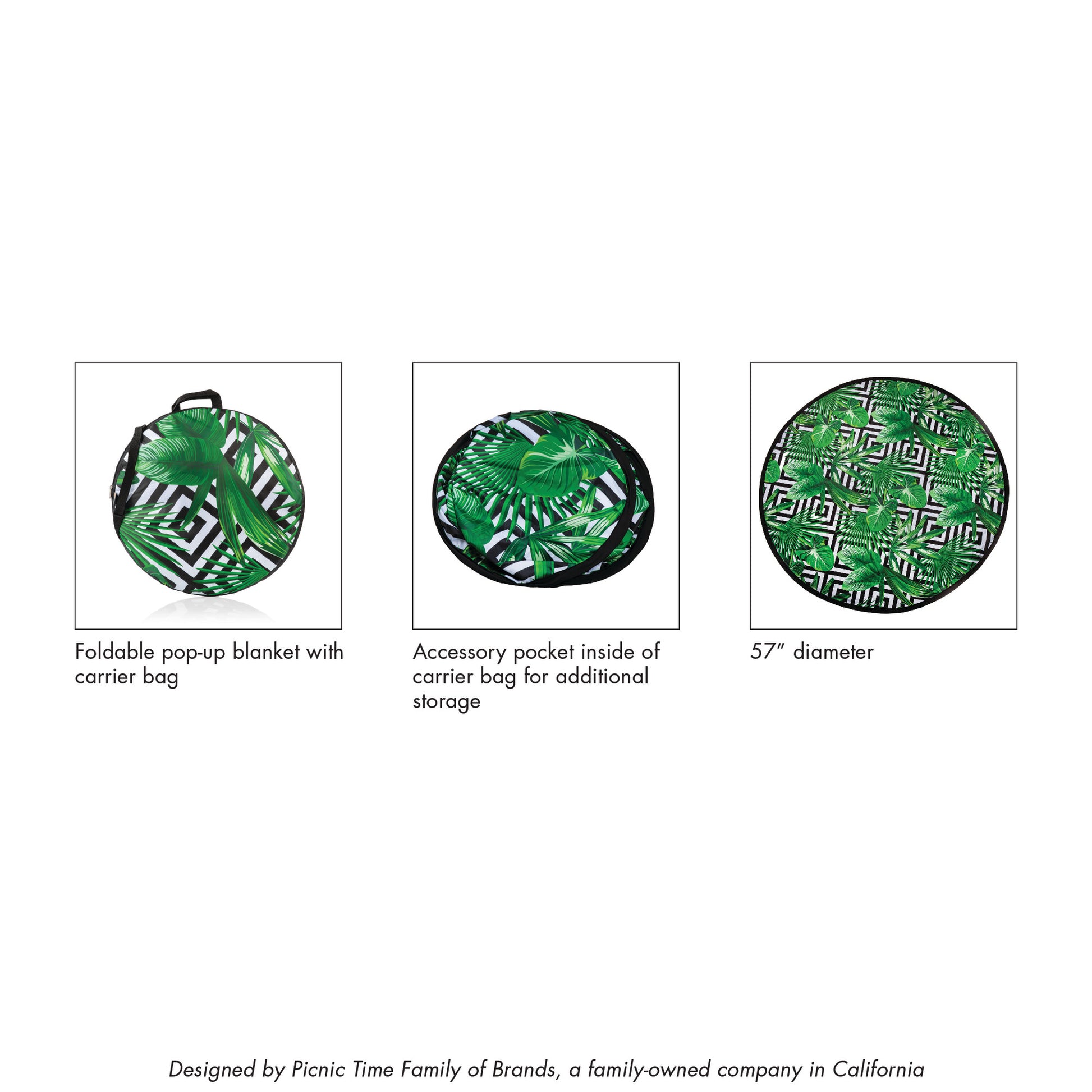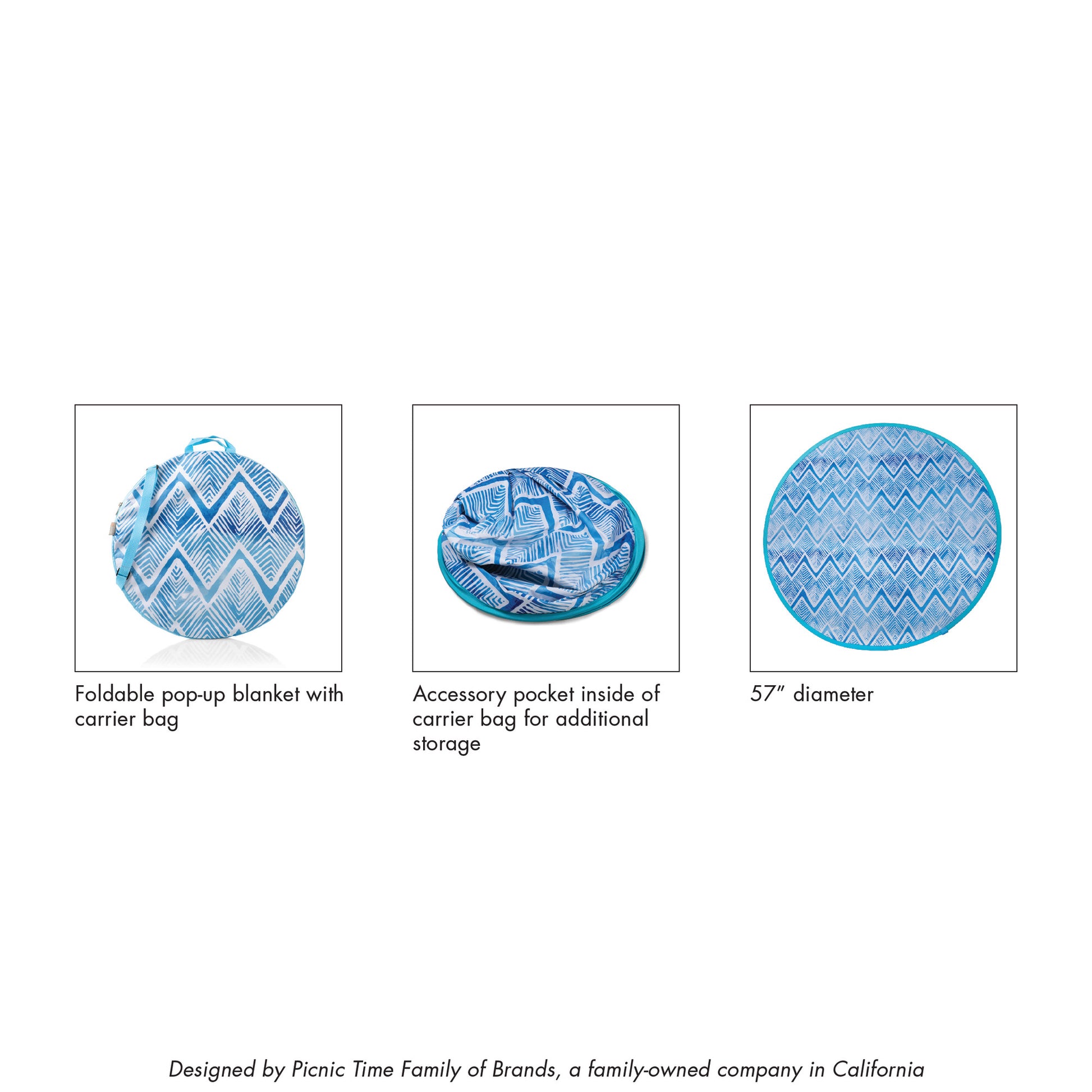 Foldable instant pop-up blanket with carrier bag; Hanging pocket inside of carrier bag for additional storage; 57’’ diameter