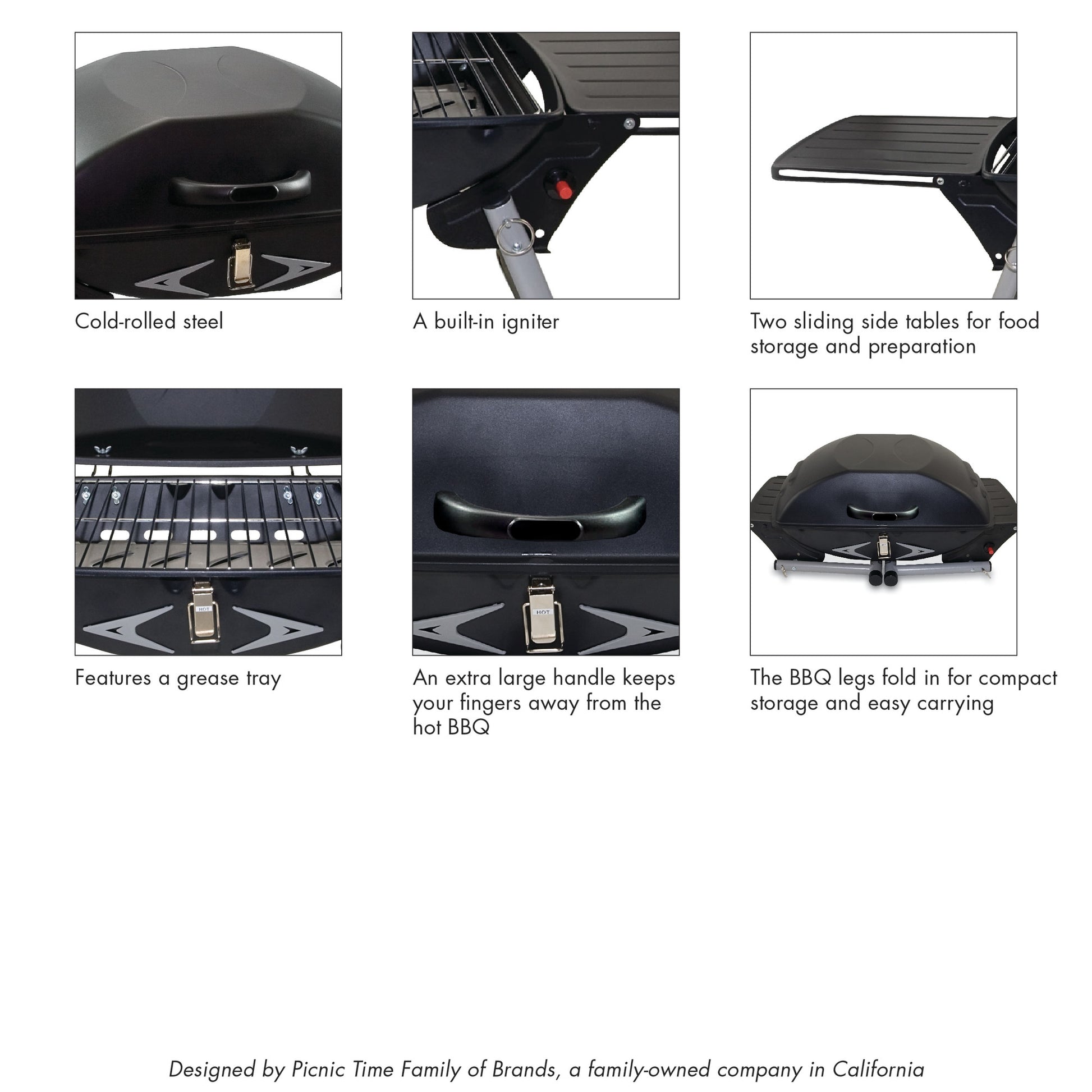 Cold-rolled steel; A built-in igniter; Two sliding side tables for food storage and preparation; Features a grease tray; An extra large handle keeps your fingers away from the hot BBQ; The BBQ legs fold in for compact storage and easy carrying