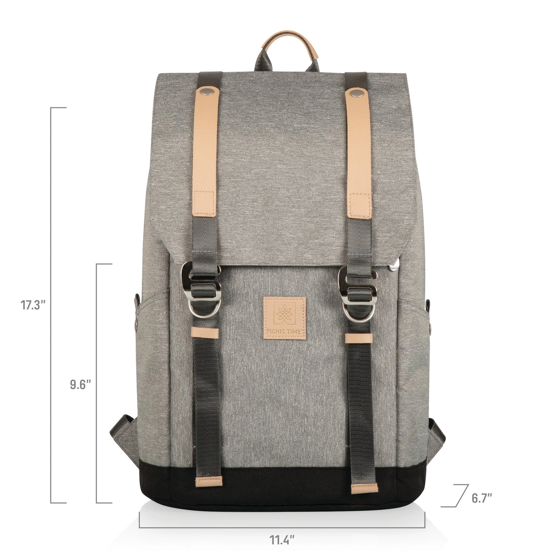 Two-tiered backpack with adjustable padded straps; Heat-sealed cooler on bottom and dry compartment on top; Adjustable front straps for additional storage; Two water/wine pockets on each side; Back of the bag cooler access with a convenient fold out design; Includes four 8’’ Melamine plates, four sets of stainless steel forks, knives and spoons, salt and pepper shakers, four durable tumblers, and one stainless steel waiter-style corkscrew; 11.4" L x 6.7" W x 17.3" H