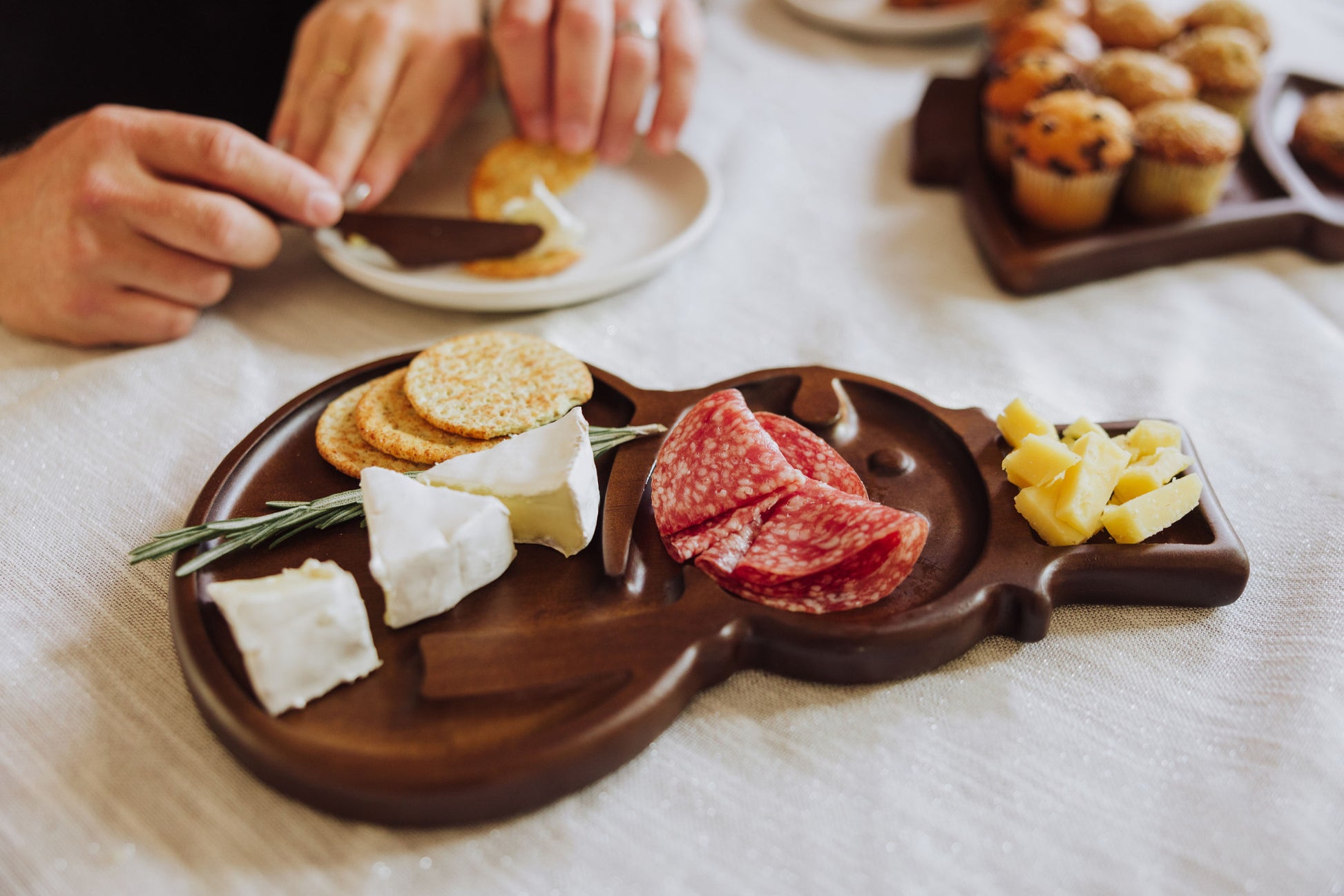 Made of dark-stained parawood; Raised design creates separate serving; Included cheese knife; Cutting surface on the back side with juice groove; 13" x 8.3" x 0.8"