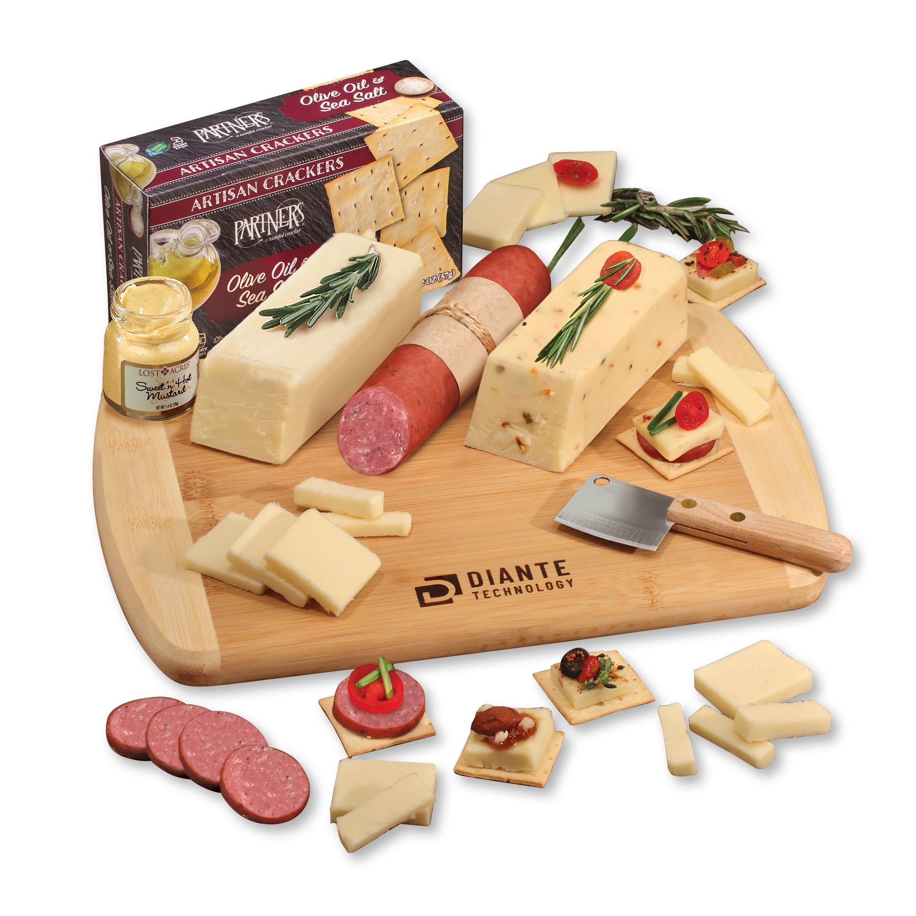 Large, seven-ounce blocks of shelf-stable Wisconsin cheeses that do not need to be refrigerated upon receipt are paired with a five-ounce stick of tangy Beef Summer Sausage and a box of Water Crackers in this fabulous charcuterie assortment. All are packaged with a handy cleaver on our sustainable Bamboo cutting board. A gift that will be enjoyed throughout the year! Serves 6-12.