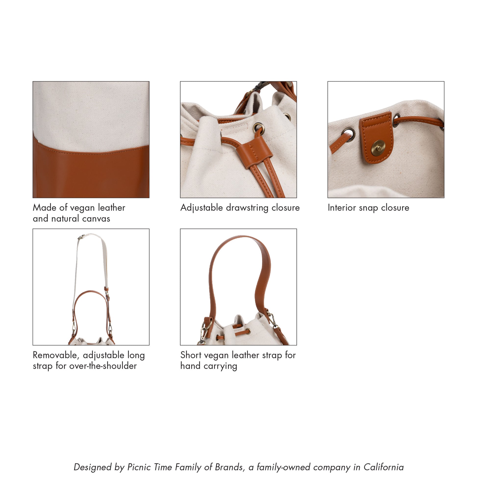Made of vegan leather and natural canvas; Adjustable drawstring closure; Interior snap closure; Two sets of carrying straps: a removable, adjustable long strap for over-the-shoulder carrying and a short vegan leather strap for hand carrying