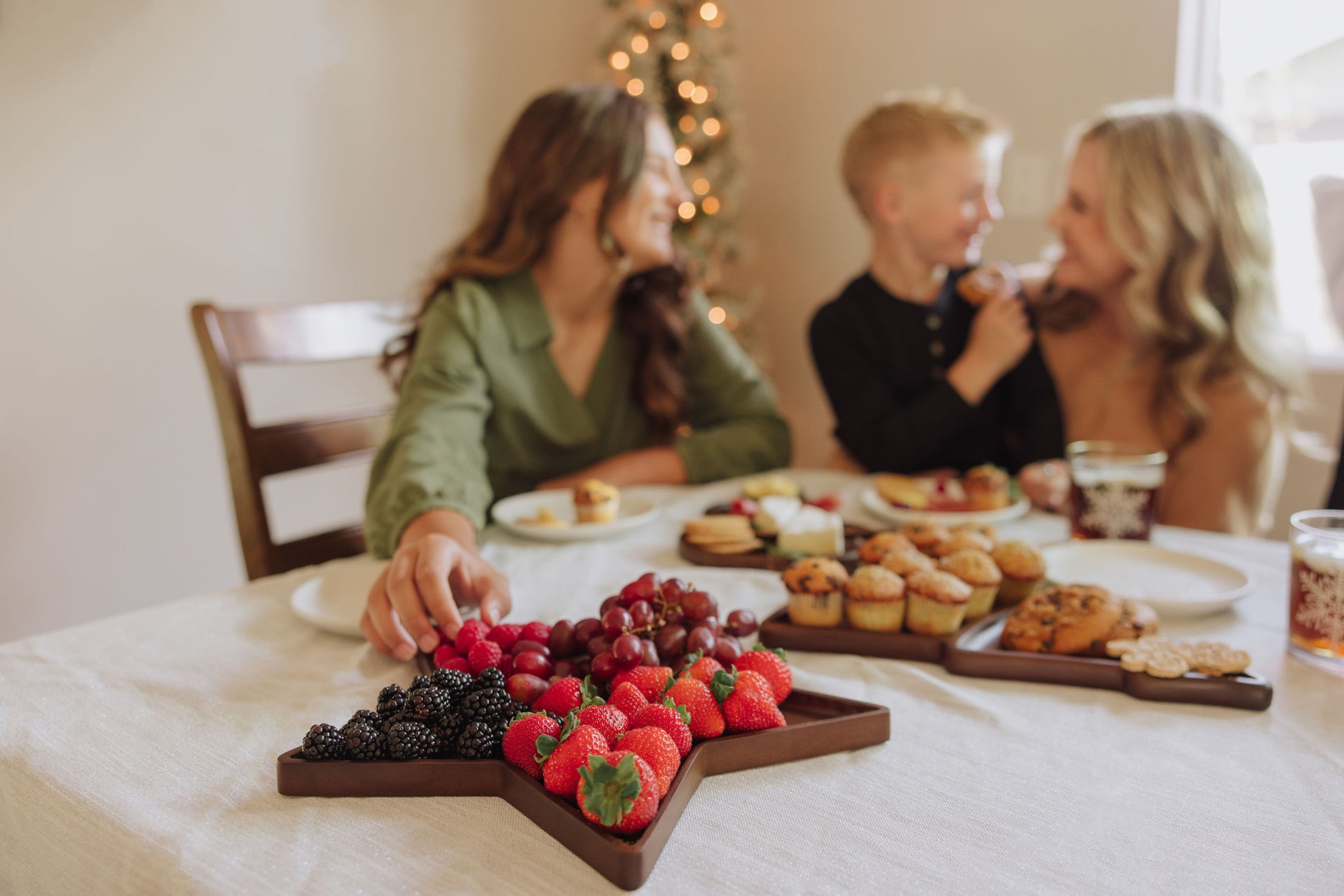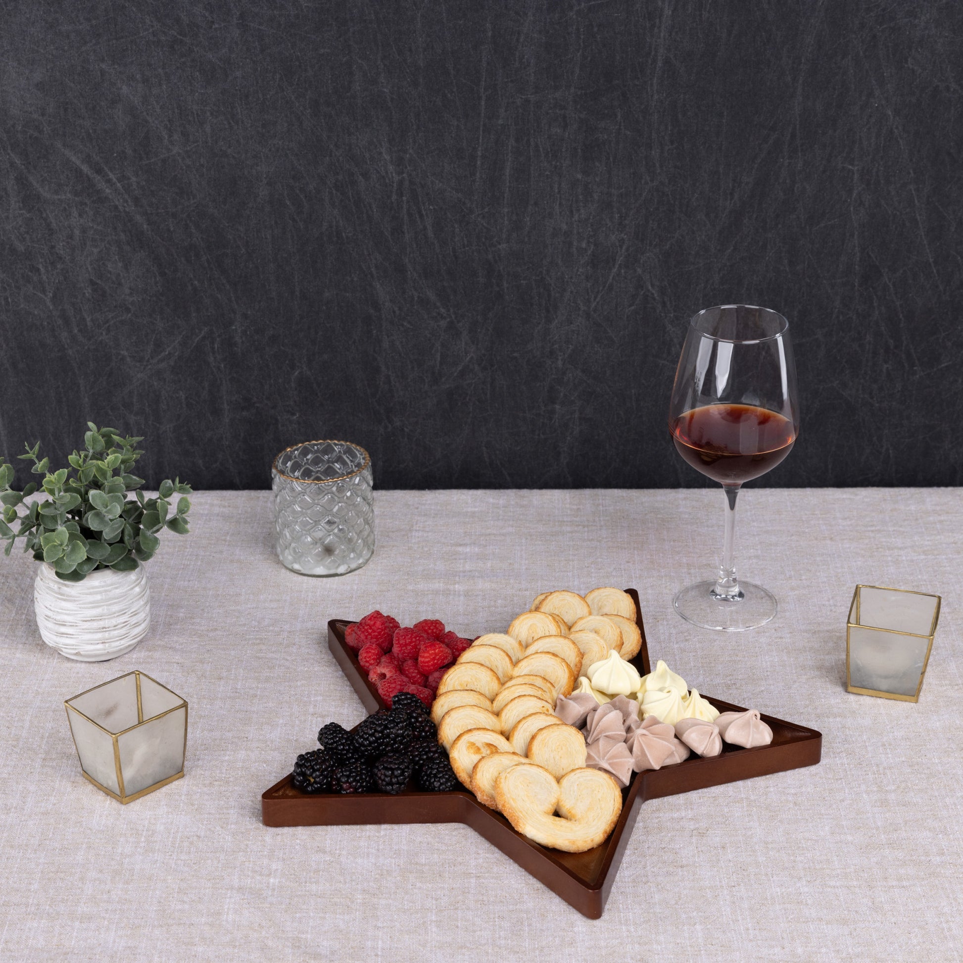 Elevate your holiday gatherings with this stunning star-shaped serving board. Crafted from durable dark-stained parawood, this board adds a touch of rustic elegance to any table setting.