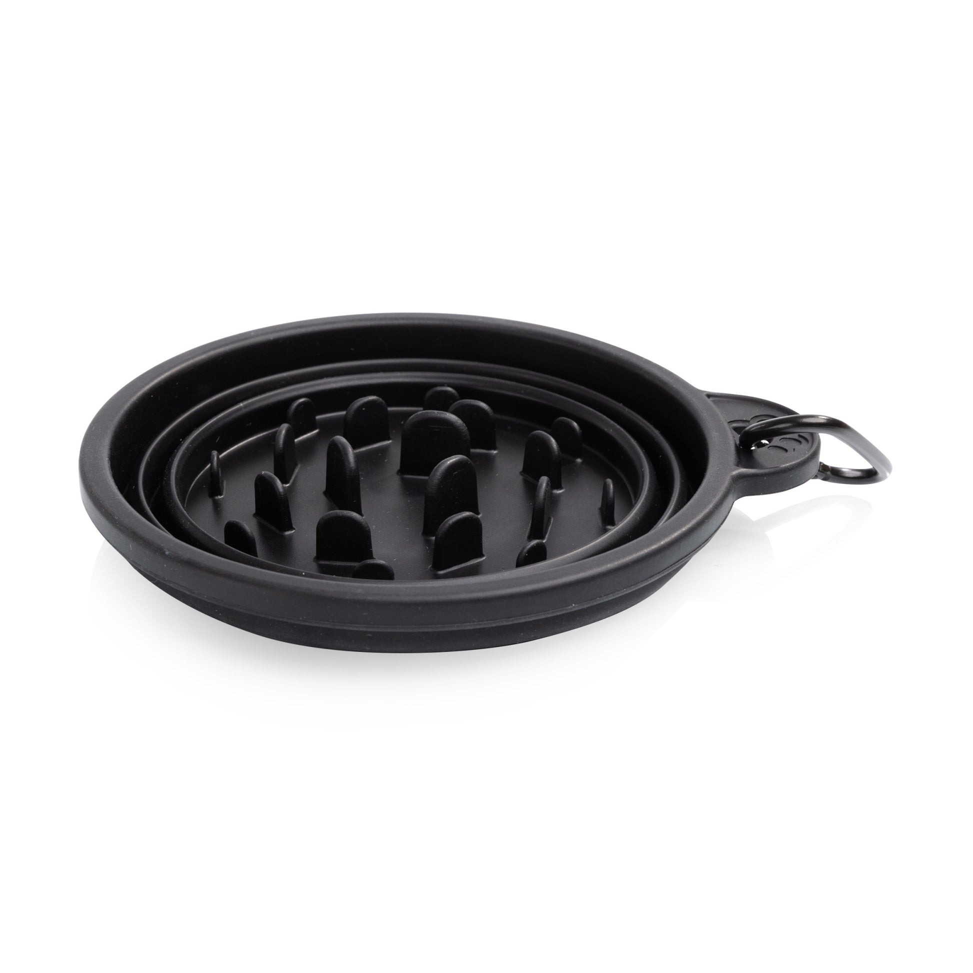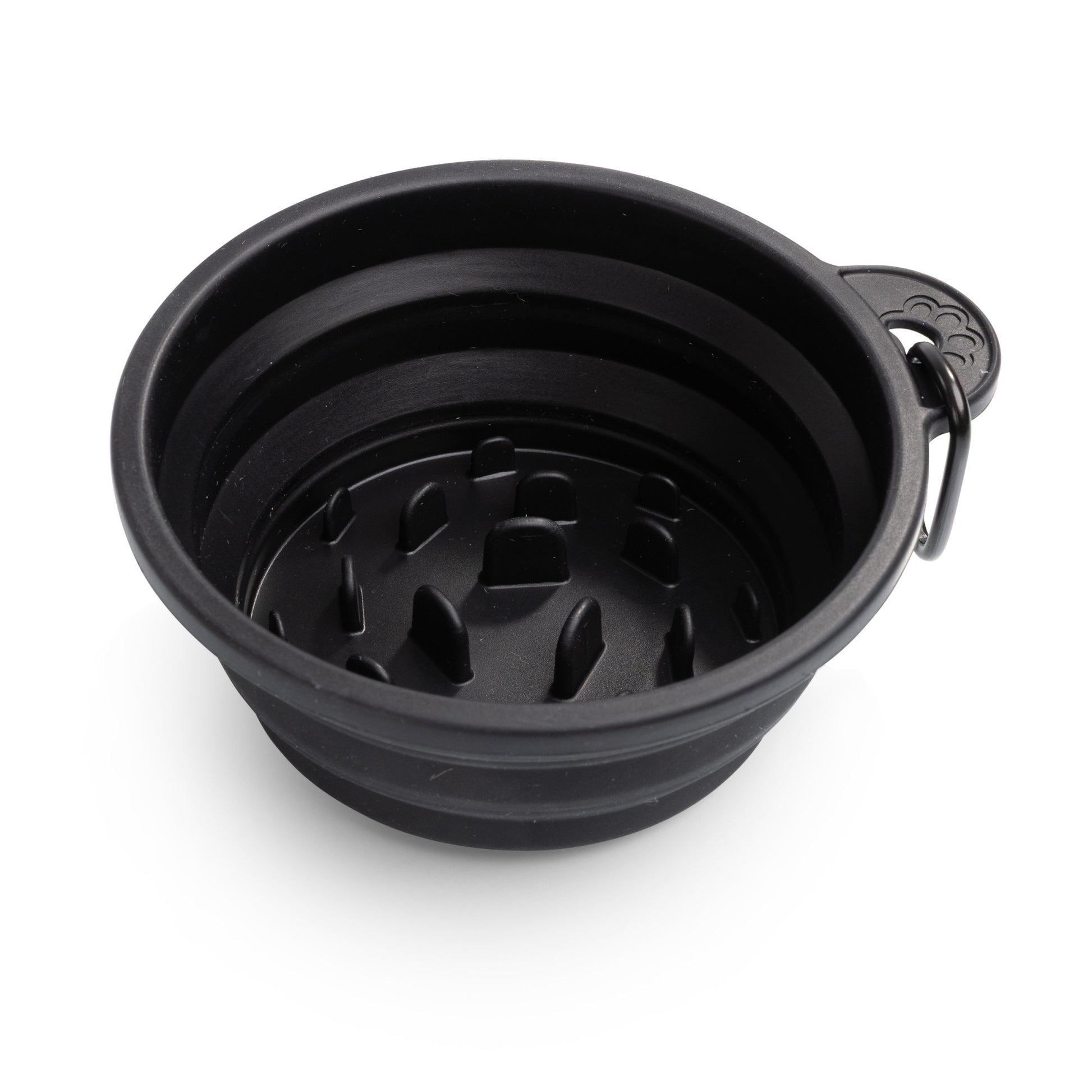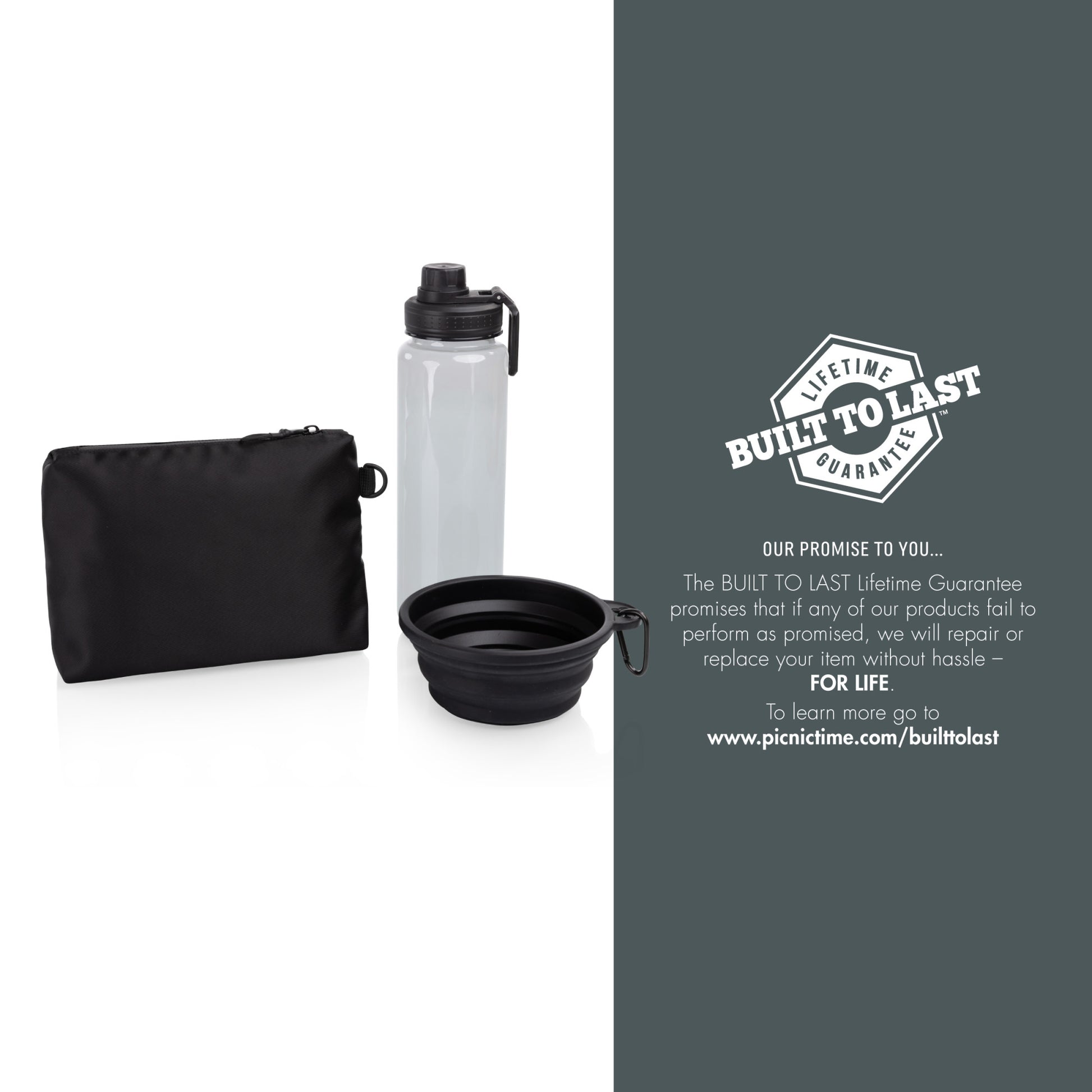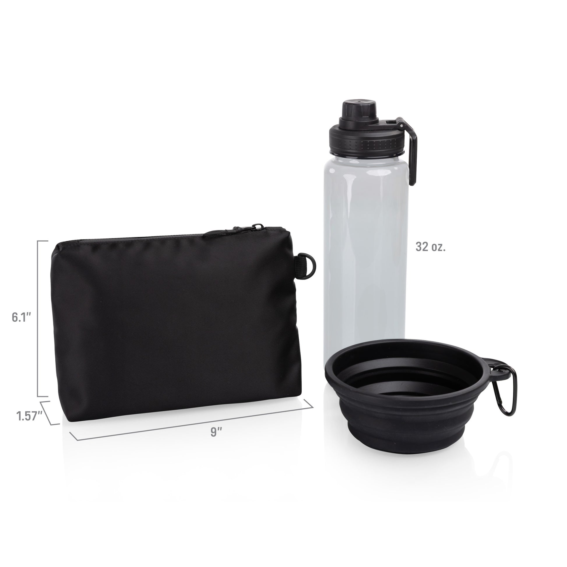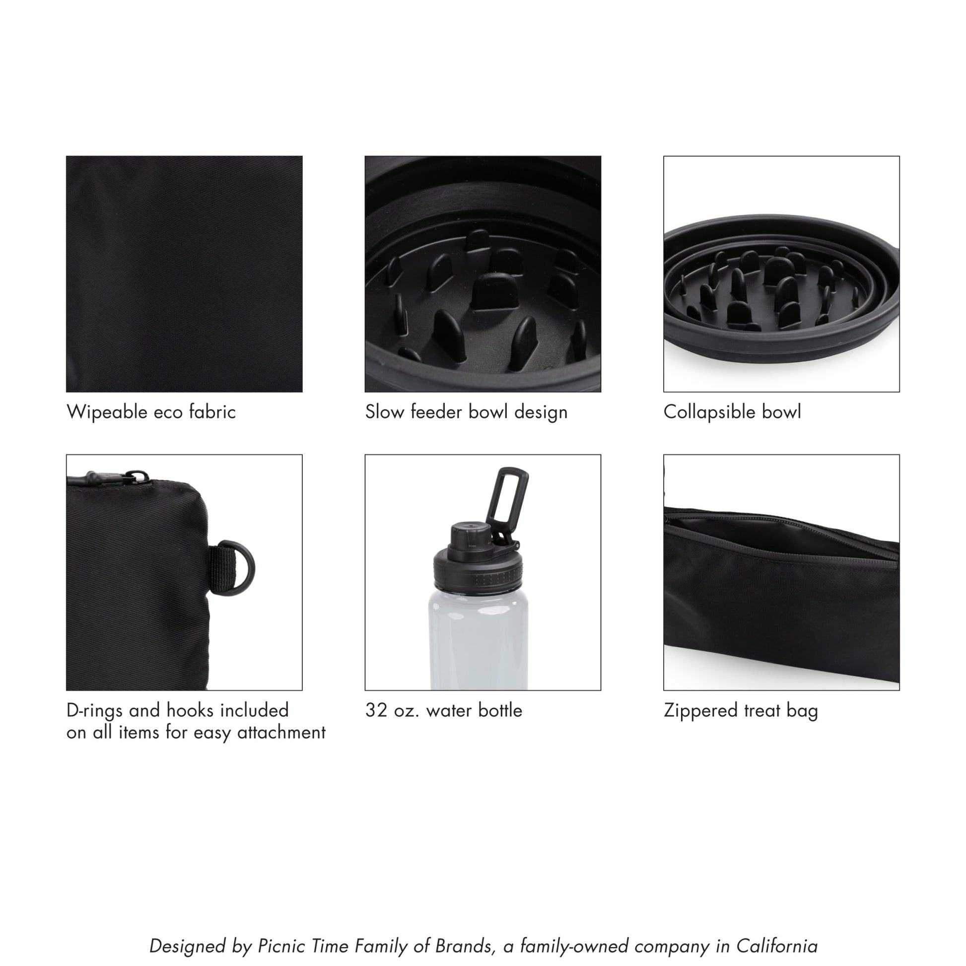 Wipeable eco fabric is made out of recycled plastic. 3 recycled bottles are utilized in each bag.; Slow-feeder bowl design; D-rings and hooks included on all 3 items for easy attachment to other bags for quick access; Includes: water bottle, collapsible bowl and zippered treat bag