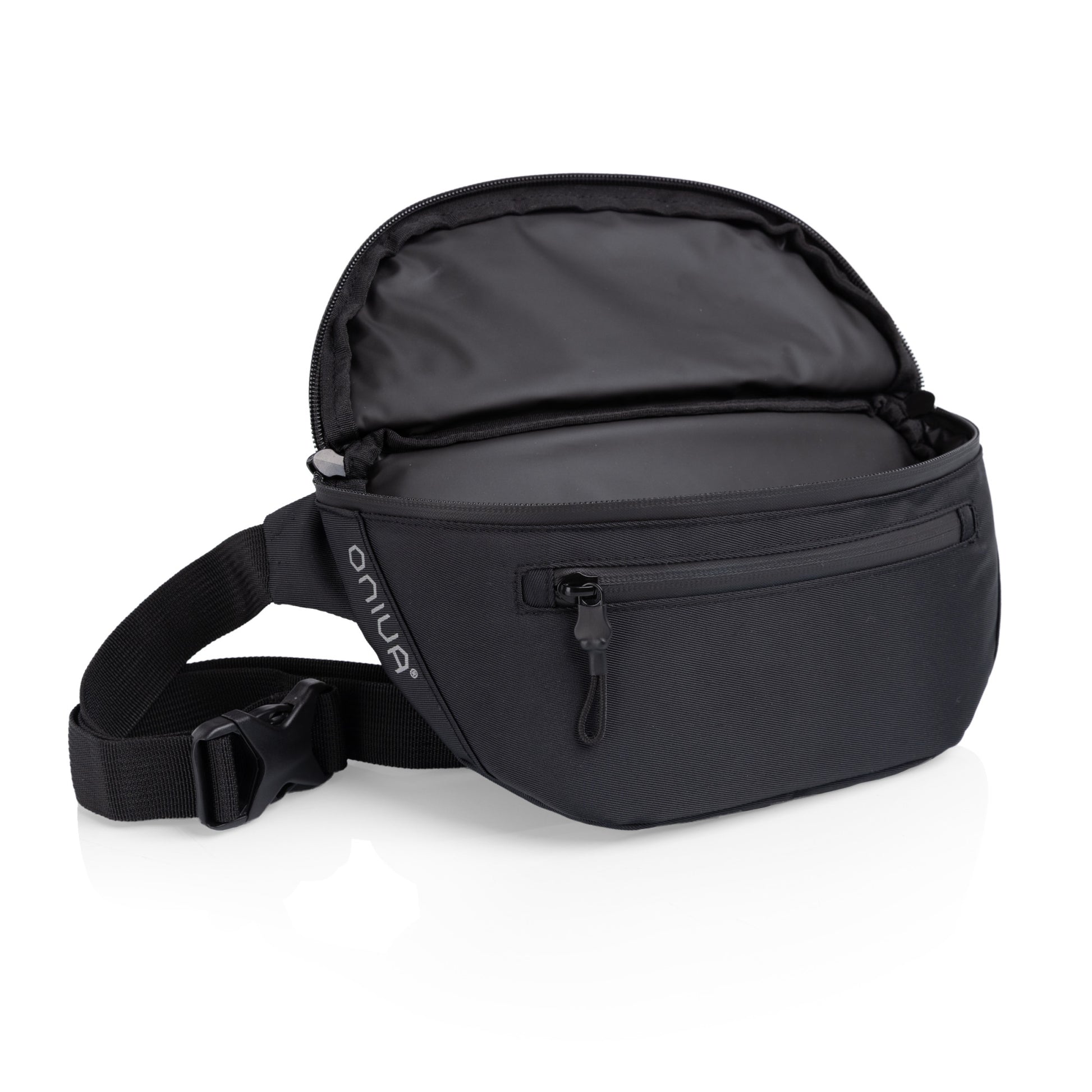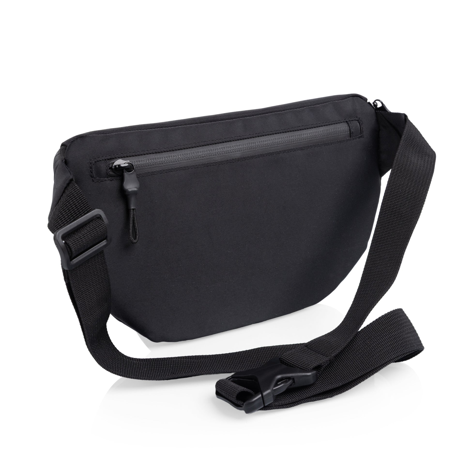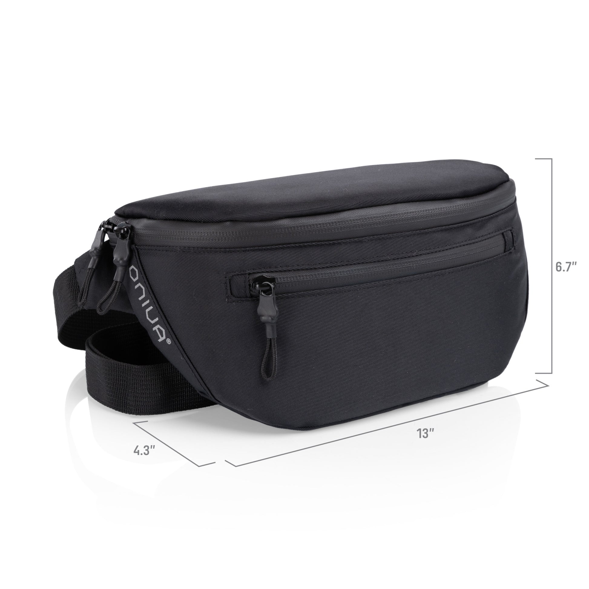 Wipeable eco fabric is made out of recycled plastic. 3 recycled bottles are utilized in each bag.; Adjustable strap design; Can be worn as a fanny pack or as a shoulder sling bag; Large insulated interior pocket for storing drinks and snacks; Two smaller exterior pockets for storing personal items like phone, keys, and wallets