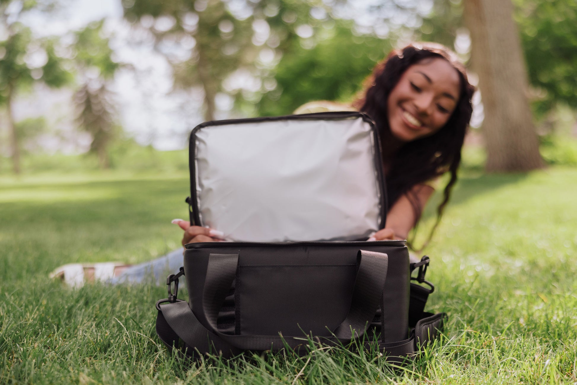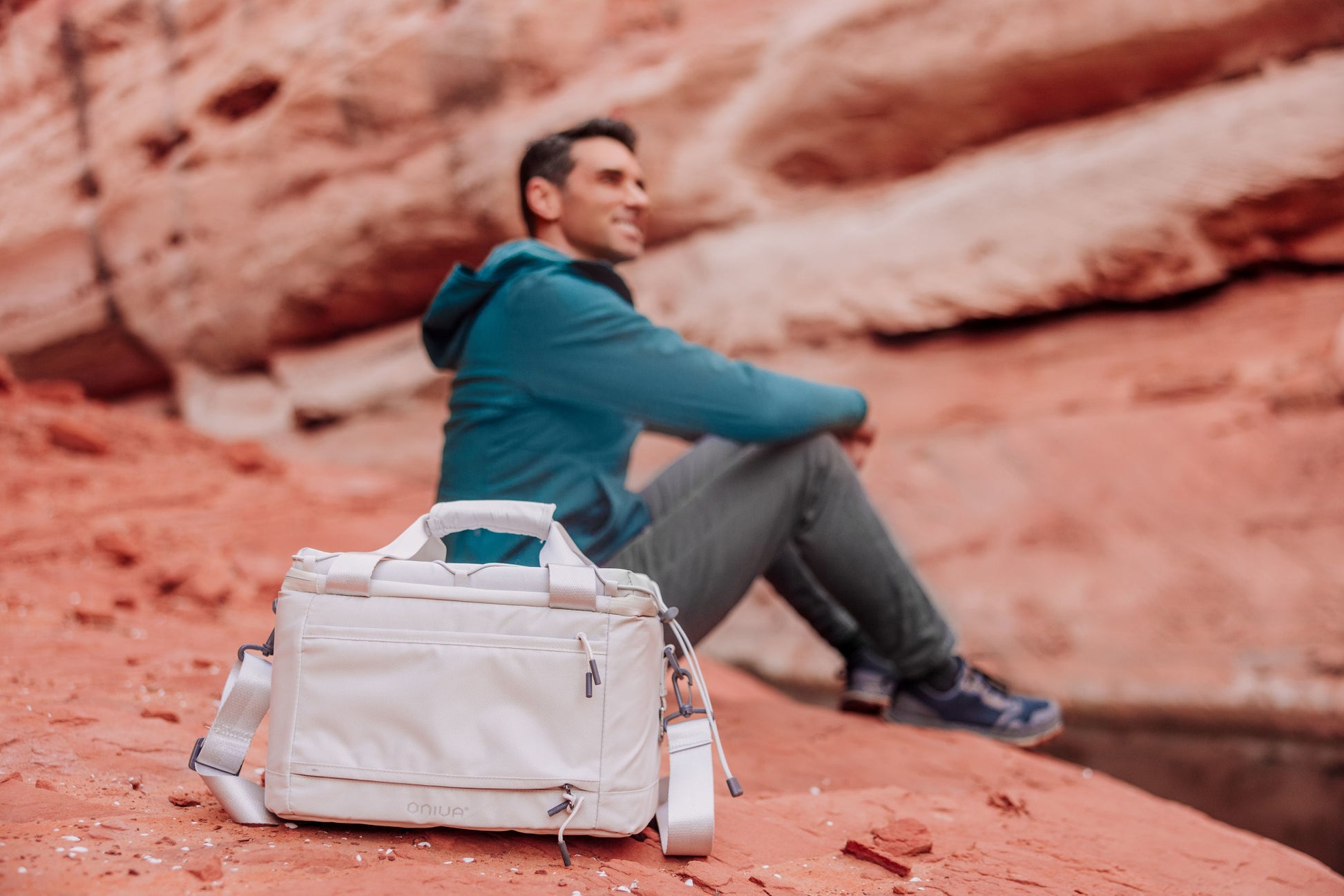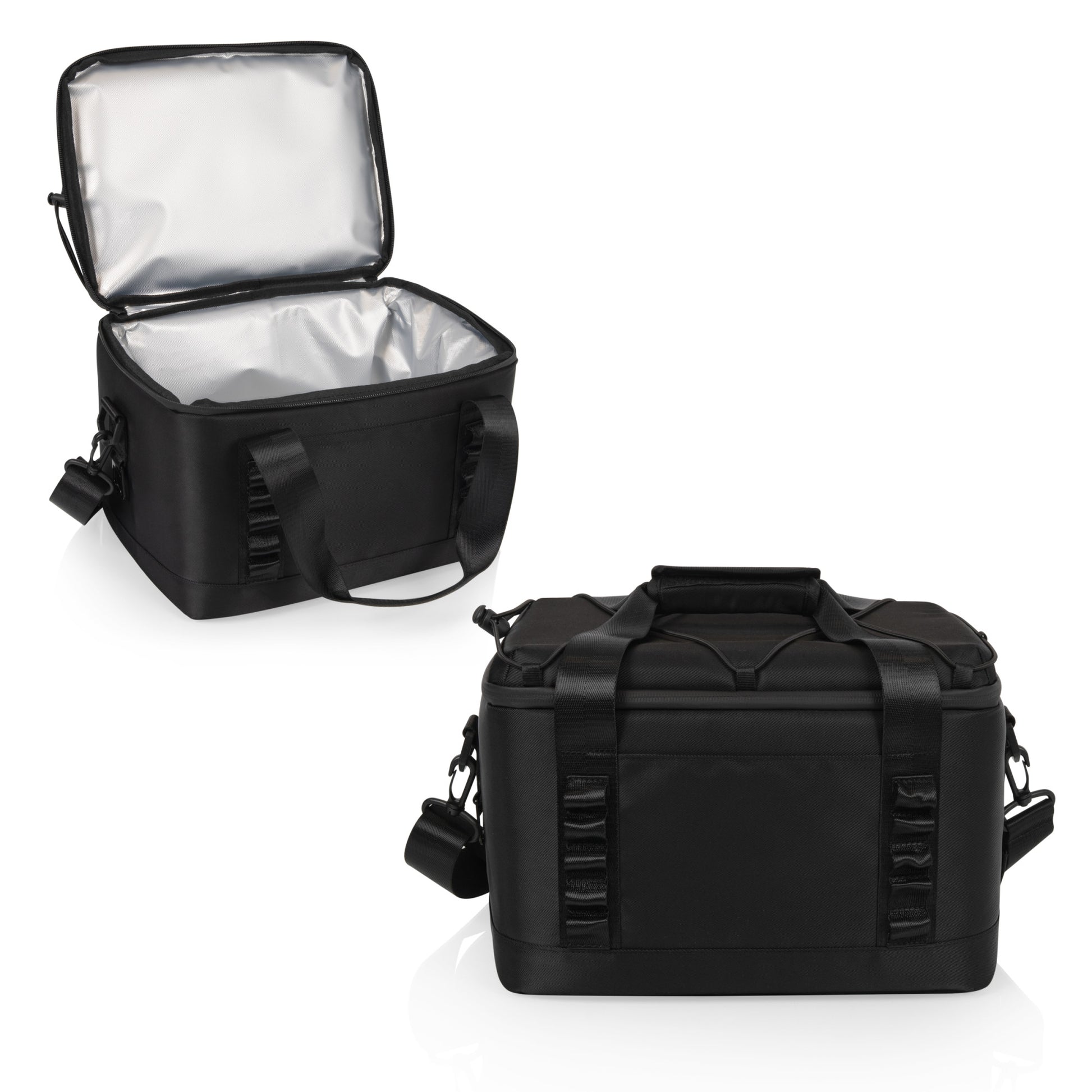 Fabric shell made of recycled water bottles, 12 bottles per bag; Wipeable fabric; Insulated cooler with water-resistant liner; Stretch cord on top secures a jacket, blanket or towel; Back zippered accessory pocket/ luggage slip; Daisy chain to hang additional gear; Versatile shoulder strap; Bottle opener attached; Cool time up to 24 hours; Holds 12, 12oz cans