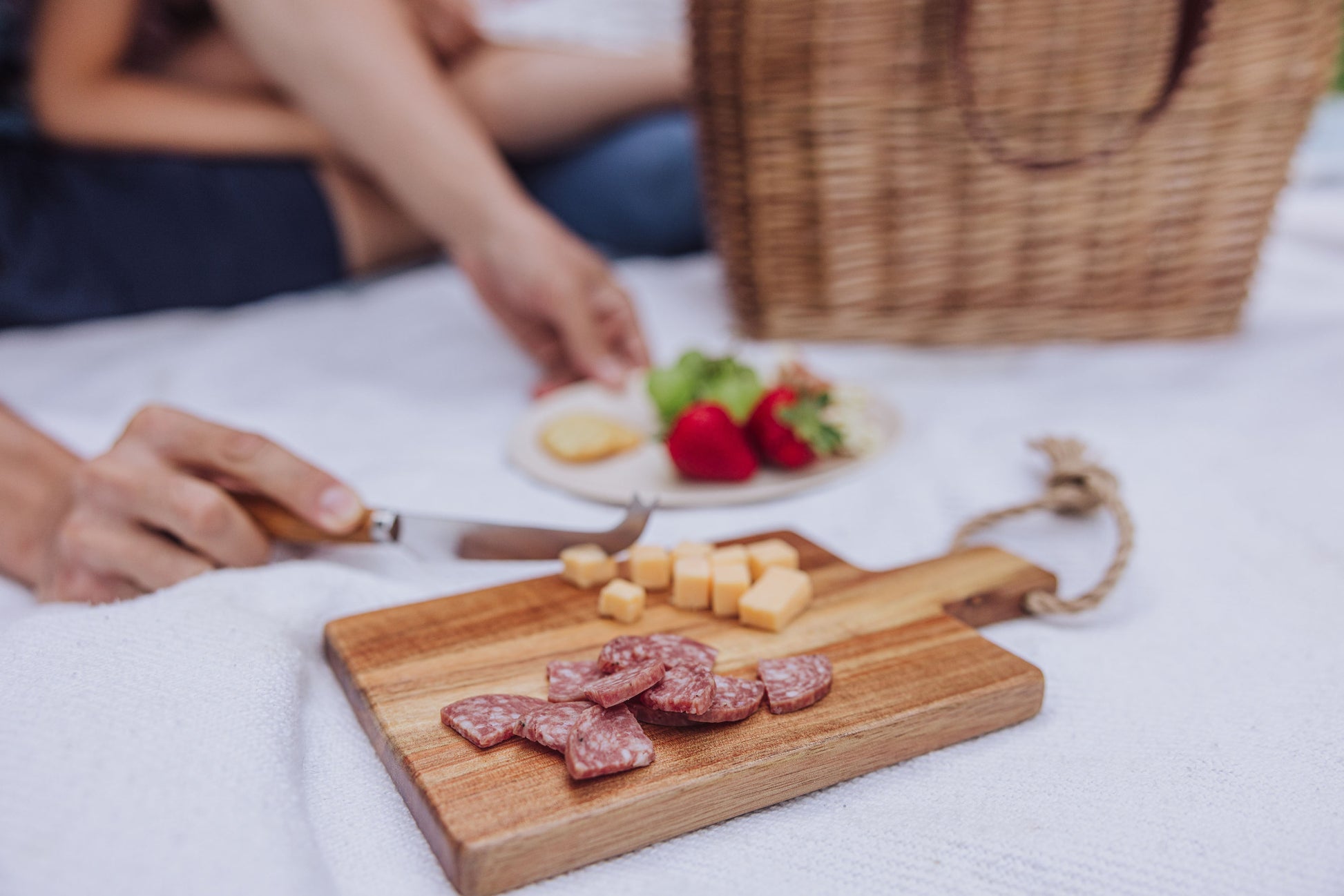Handwoven from eco-friendly willow; Basket capacity of 28 cans; Comfortable vegan leather carrying straps produced from renewable biological resources; Removable components folder made from recycled cotton includes: • 2 Sets of stainless steel utensils • 2 Recycled soda lime glass cups • 2 Bamboo fiber plates • 1 Acacia wood cutting board • 1 Acacia and stainless steel cheese knife • 1 Stainless steel corkscrew; This picnic basket and its components are made from sustainable and reusable materials to help reduce the need for single-use products and reduce this item's carbon footprint. To learn more about our sustainability efforts, please visit picnictime.com/pages/sustainability