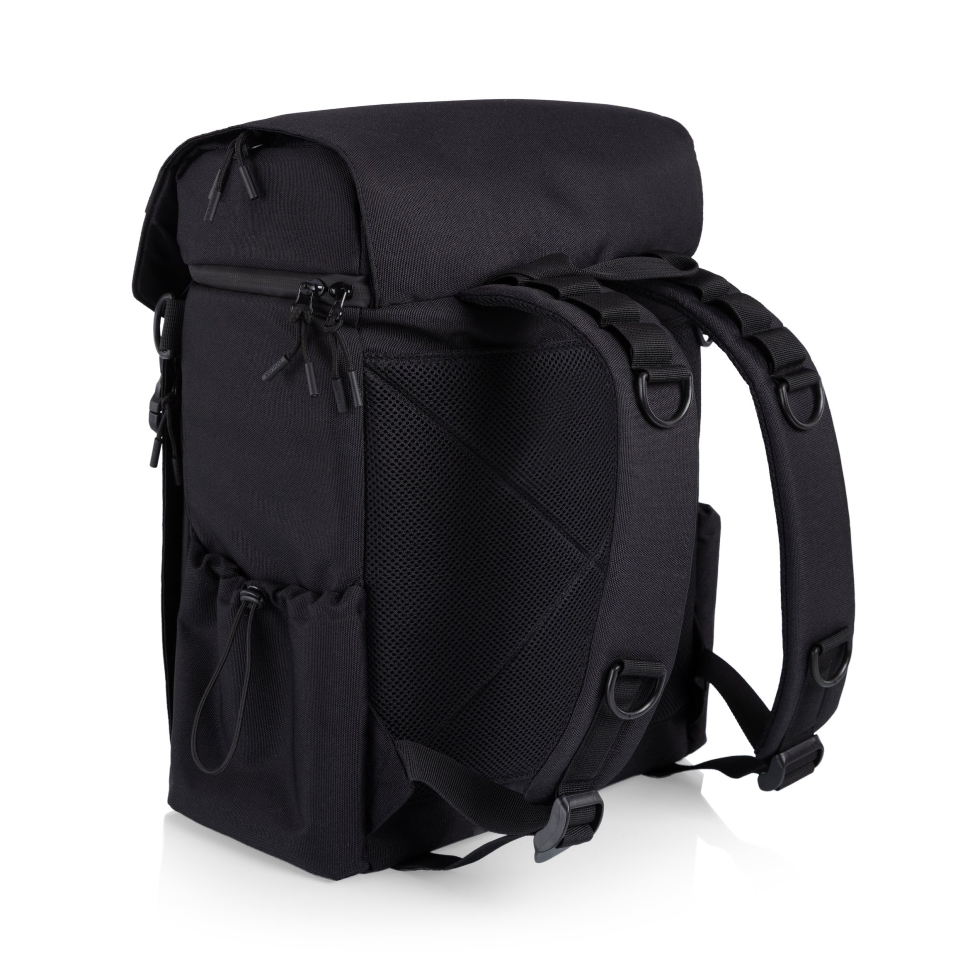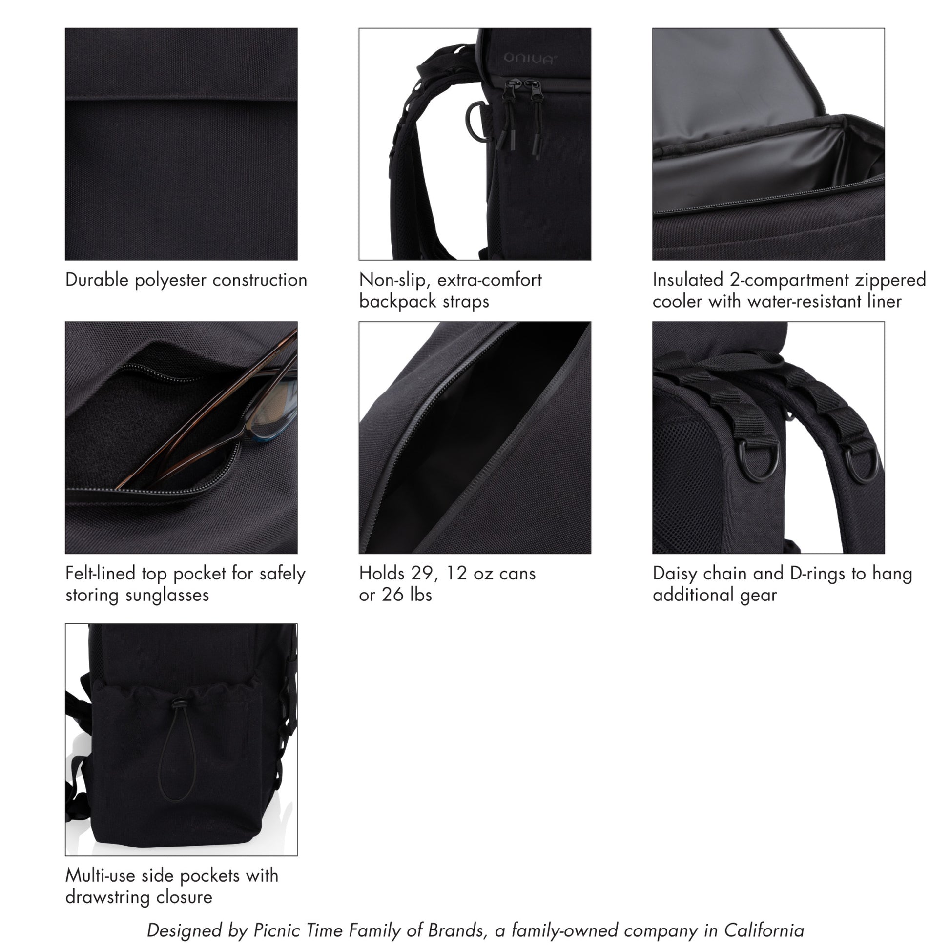 Durable 900D polyester construction; Non-slip, extra-comfort backpack straps; Insulated 2-compartment zippered cooler with water-resistant TPU liner; Felt-lined top pocket for safely storing sunglasses; Holds 29, 12 oz cans or 26 lbs; Daisy chain and d-rings to hang additional gear; Multi-use side pockets with drawstring closure