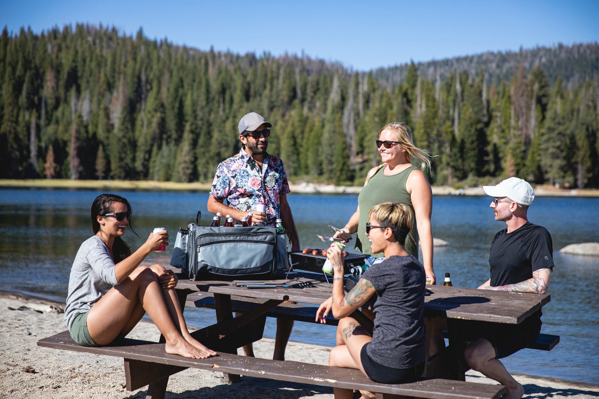 Patented design; Cooler nests inside the compartment that houses the portable gas BBQ; Tote can carry the BBQ and a fully-loaded cooler at the same time; Cooler holds up to 24 12-oz soda cans; Tote features an adjustable shoulder strap with comfort pad, a reinforced waterproof base, three large zippered exterior pockets to store personal effects, padded carry handles, and a stretch cargo cord on the top of the tote to carry a blanket or towel