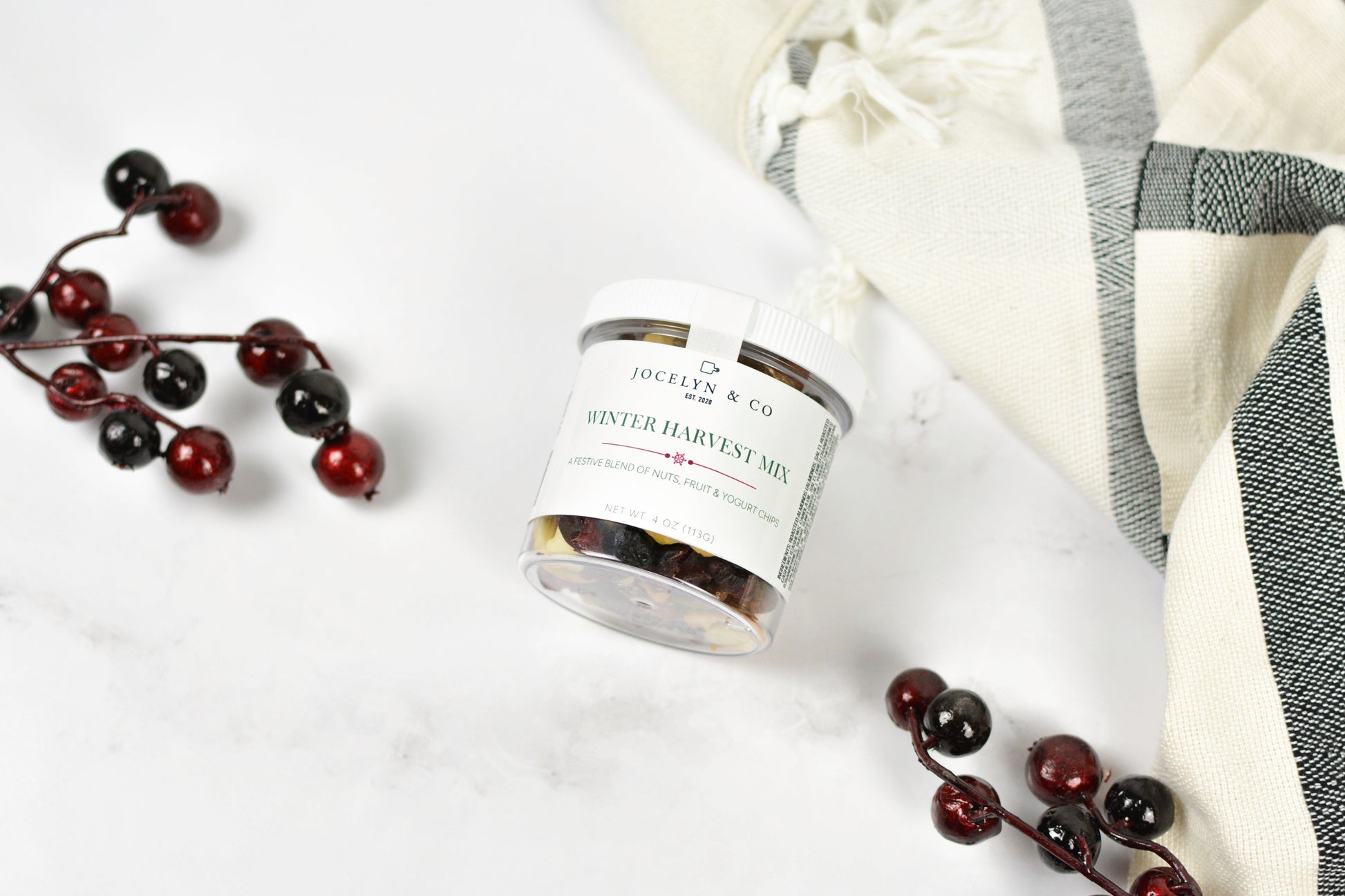 Bring the flavors of the season to life with our Winter Harvest Mix—a delightful medley of crunchy nuts, sweet dried fruits, and creamy yogurt chips. Perfectly balanced and full of festive charm, this blend is ideal for holiday snacking, gifting, or elevating your seasonal charcuterie boards. Packaged in a convenient 4 oz jar with elegant winter-themed branding, it’s a wholesome treat that adds a touch of joy to every nibble.