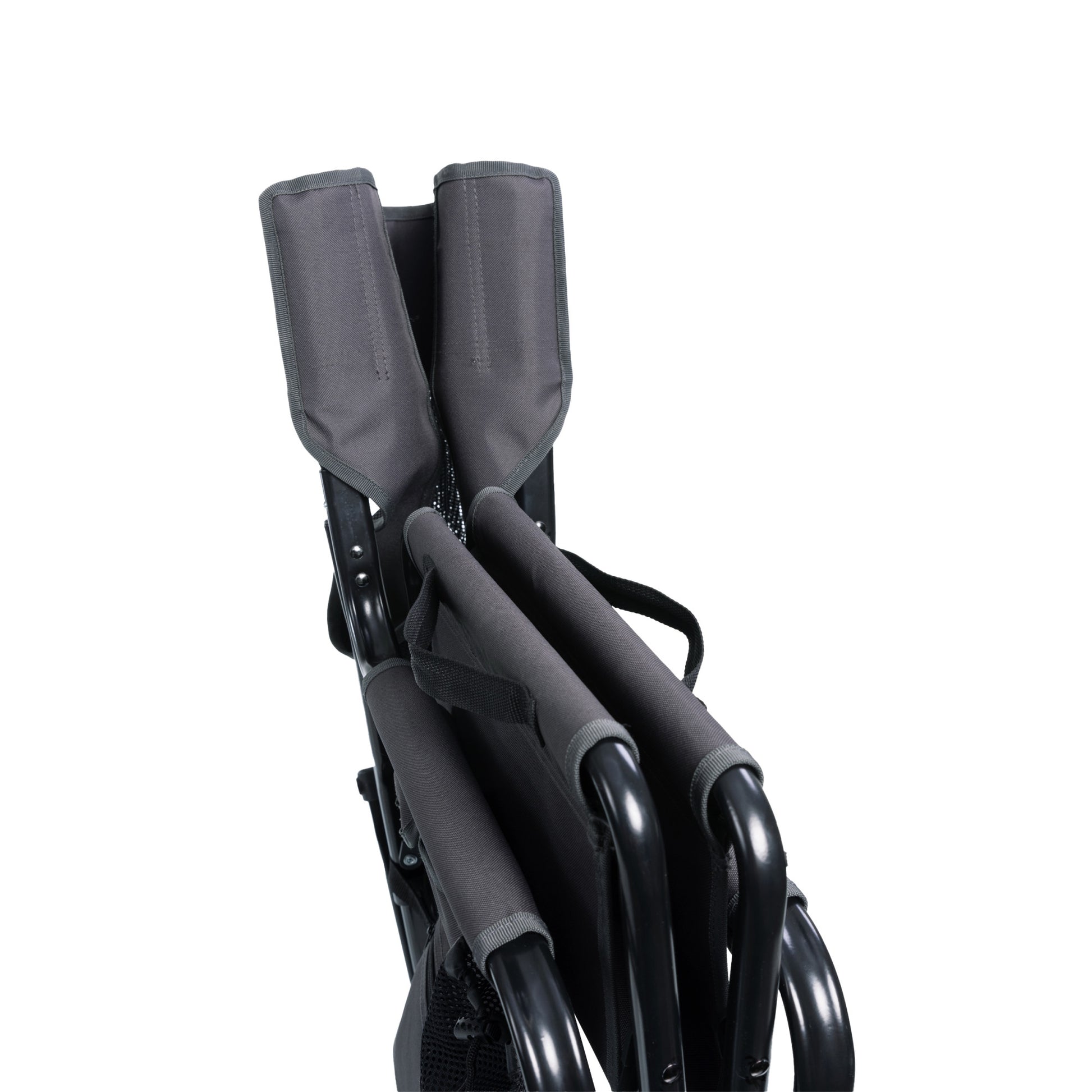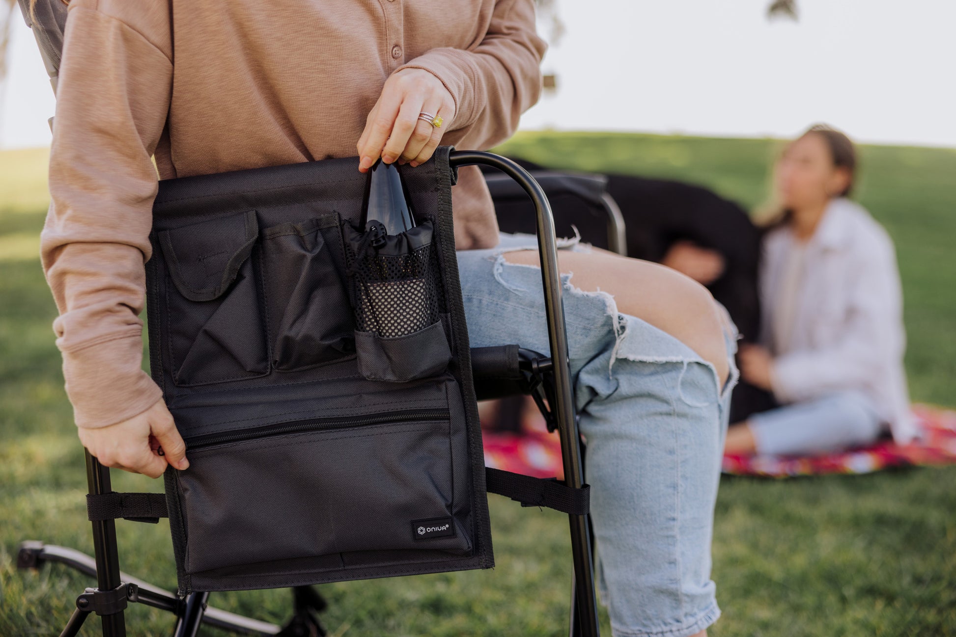 Strong aluminum frame; Breathable mesh fabric; Easy to store and carry; 225 lbs weight capacity; Detachable armrest storage caddy; 24" x 34" x 35.5"